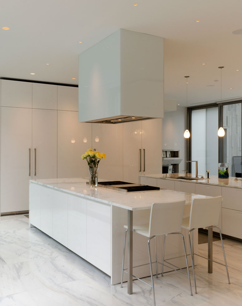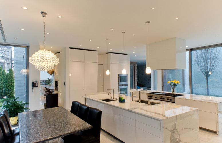 A study in modern simplicity, this stunning eat-in kitchen is as functional as it is luxurious. Floor to ceiling windows invite the surroundings in, bathing the space in natural light. Barely-there recessed lights provide cheerful illumination in tandem with charming teardrop pendants and the lovely Giogali Pendant from Vistosi above the table.