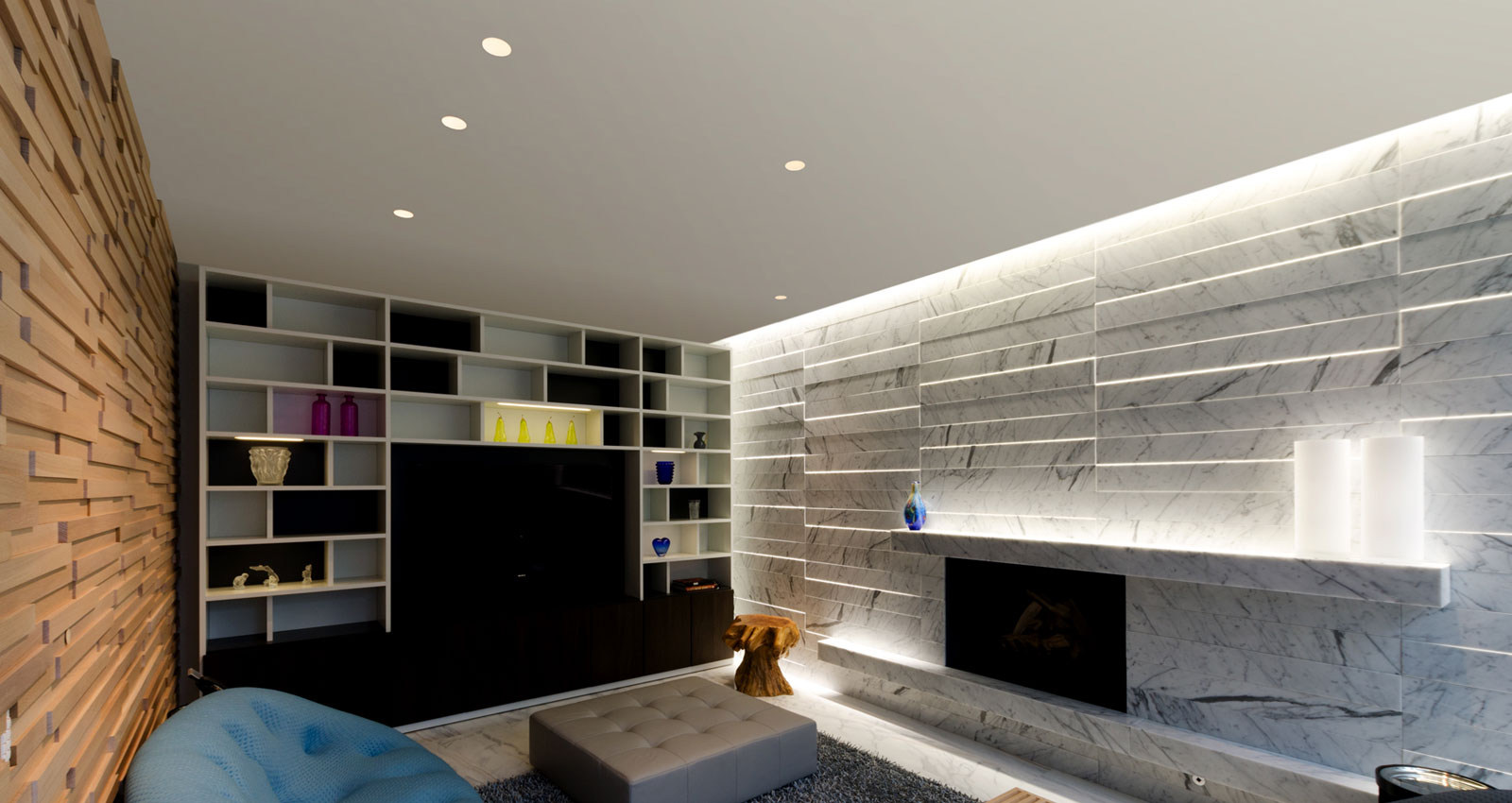 Understated, purposeful lighting throughout the home gently accentuates the textures and colors that define each space. Recessed downlights combine with refined sconces and wall grazers to highlight the beauty of every surface.