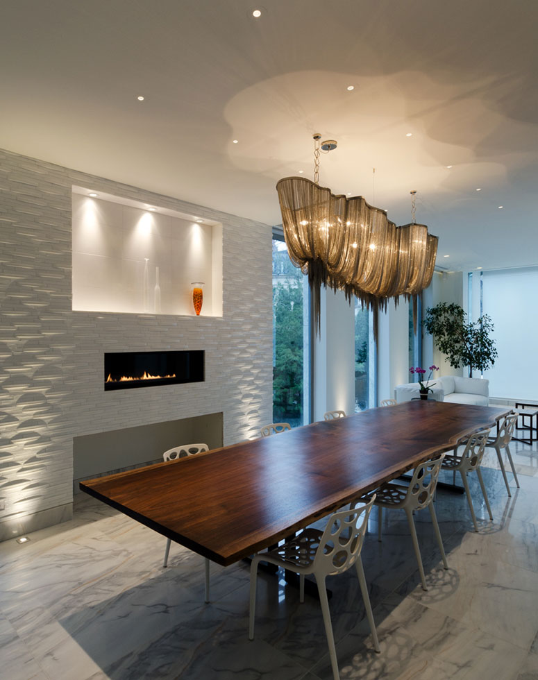 This house incorporates lighting at every level to create warmth in this modern, streamlined space. Recessed uplights cast their glow on the walls and pillars enhancing the architecture while making hard edges softer. The ultra-chic Atlantis linear chandelier is a showstopper, bringing gorgeous contrast to the dining room.
