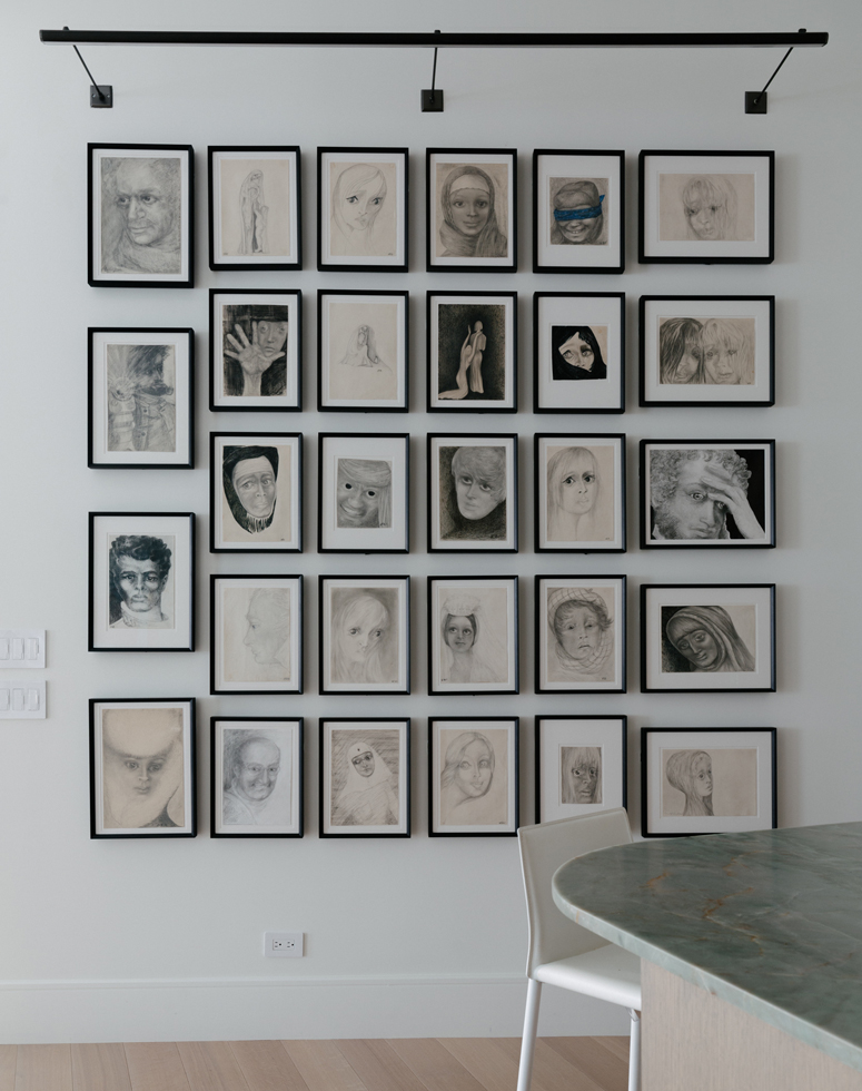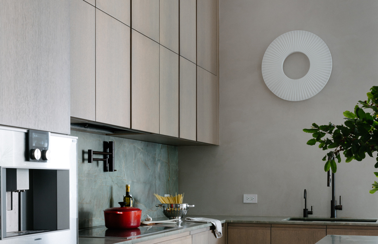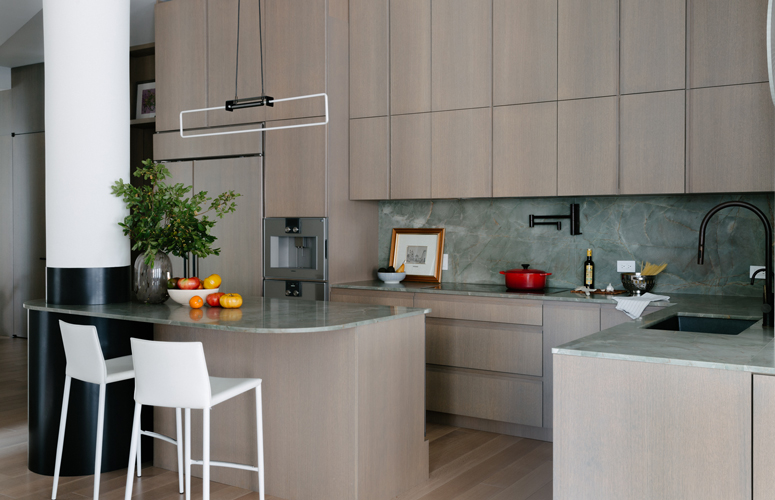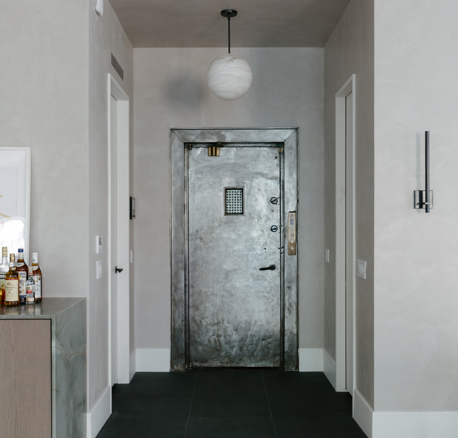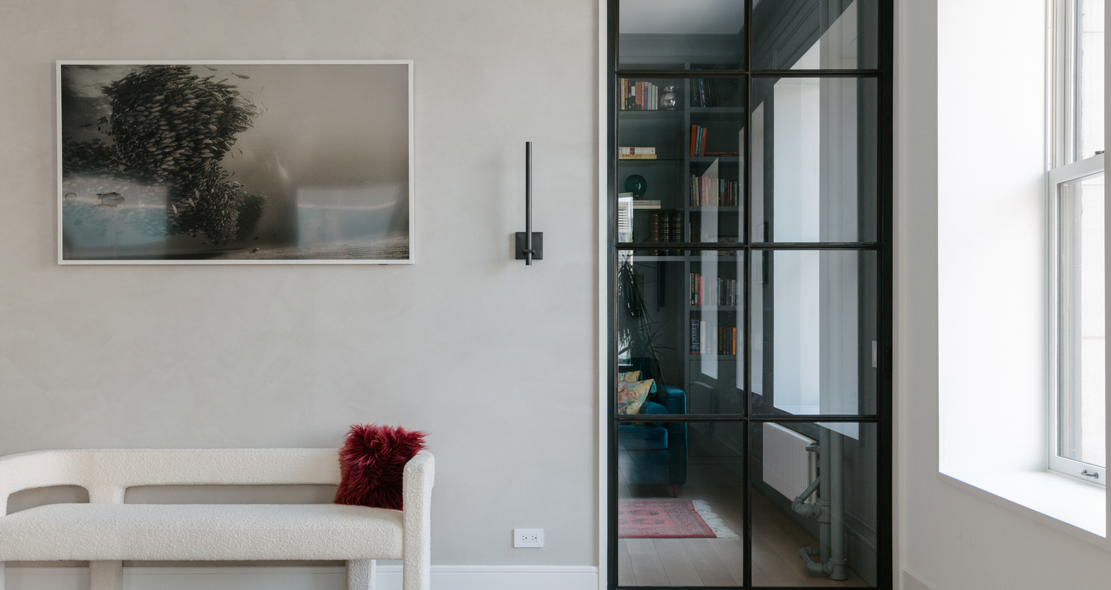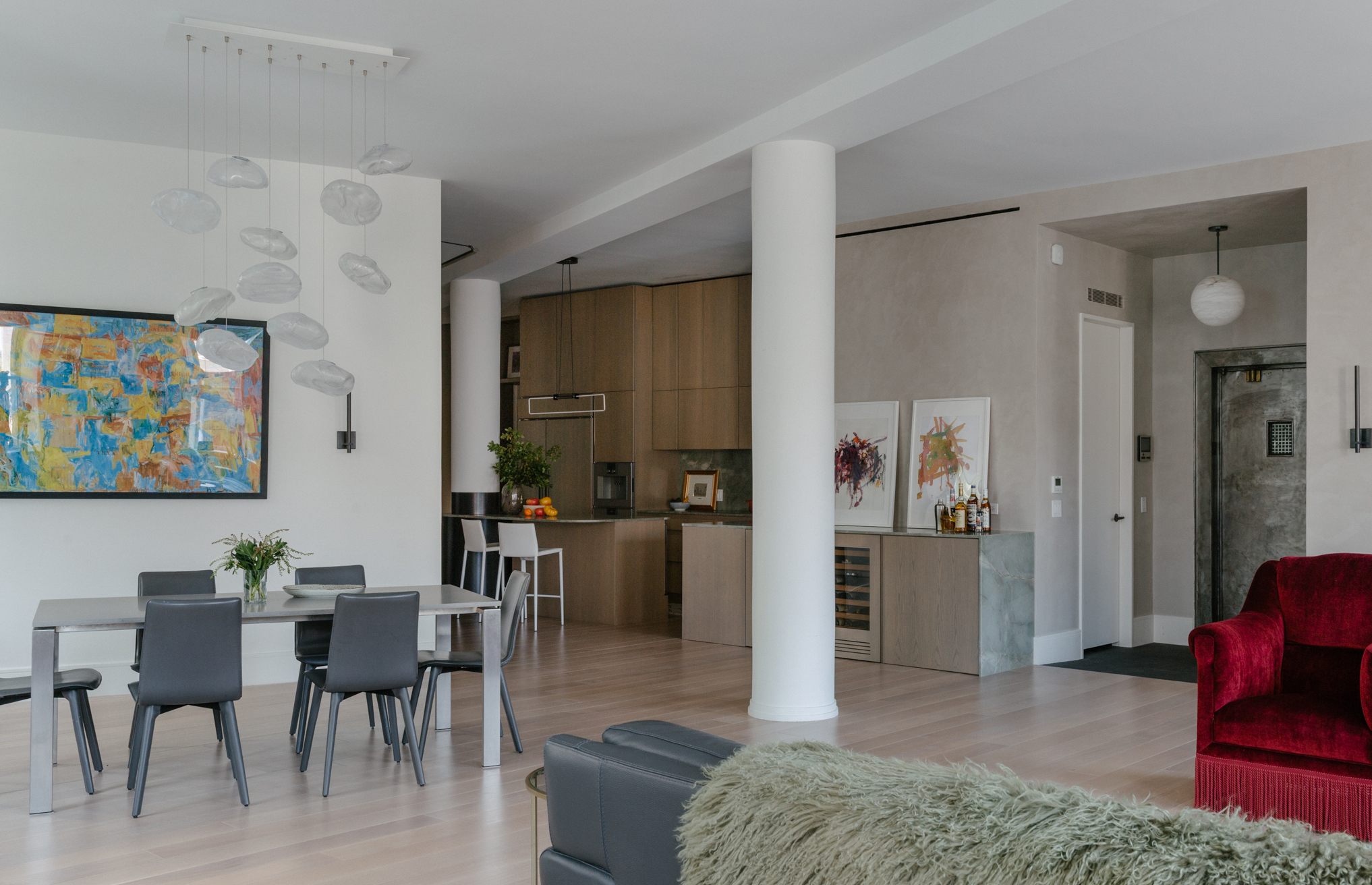 A palette of natural matte wood, concrete, oil-rubbed steel, venetian plaster and stone bring a touch of nature into bustling downtown NYC, while architectural features - like the factory's original pillars - carry historic drama into present day. A matte black pot-filler, industrial sliding doors and artful wall displays show that every little detail matters - the little things are always a telltale sign of a thoughtful renovation.