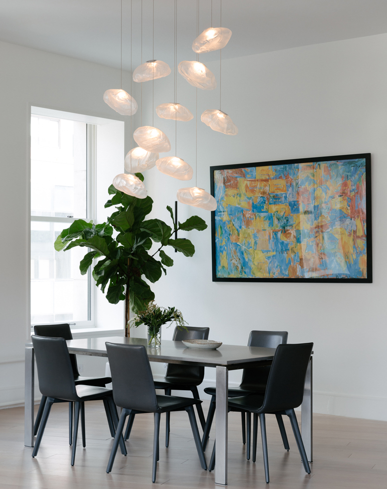 The concept behind this project was to modernize this former NYC factory, while peppering little hints of the buildings past throughout. Neutral tones and earthy textures serve as the perfect backdrop for colorful art and statement lighting. The dining table serves as a focal point, thanks in part to the Series 73 Multi Light Pendant, which presents as a floating sculpture both on and off. In the kitchen, the Ra Pendant delivers industrial minimalism over the island, a nod to the buildings foundry roots. Adding a bit of softness to the space is the Iris Wall Light by Dix Heure Dix, a ring of white overlapping ribbon with a soft, mesmerizing glow.