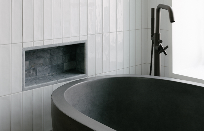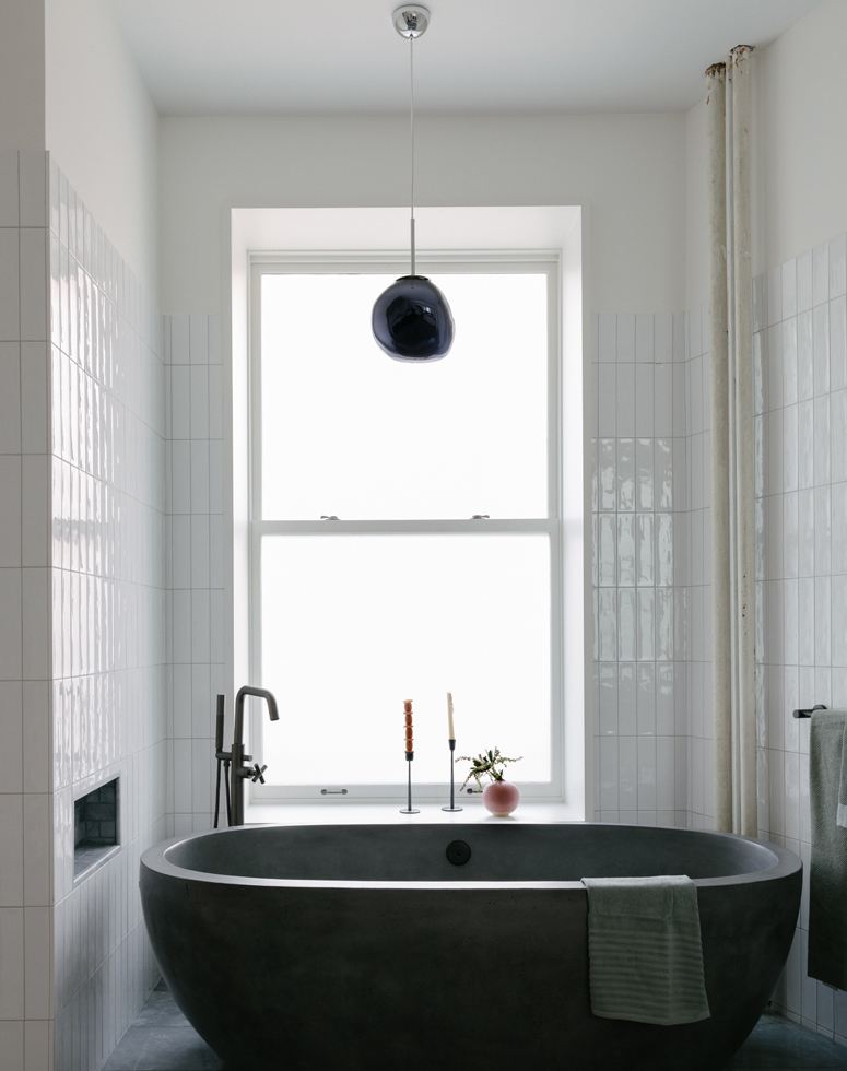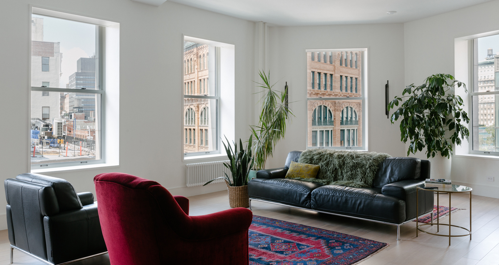 The bathroom is the sanctuary of the loft, with honed white hues, cool grey stone and ample natural lighting - filtered for privacy. The oversized slate soaking tub is the star of the space, capped by the organic, almost futuristic Melt Pendant by Tom Dixon. Simplicity is key to creating a relaxing environment, which means each piece needs to be extra-special. In the spacious living room, greenery keeps things fresh while abundant windows bring in the city life - like a treehouse floating above the bustling streets below.