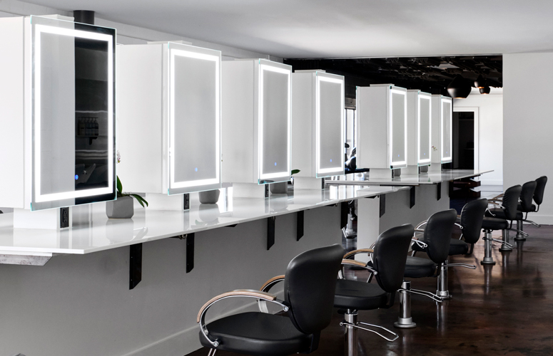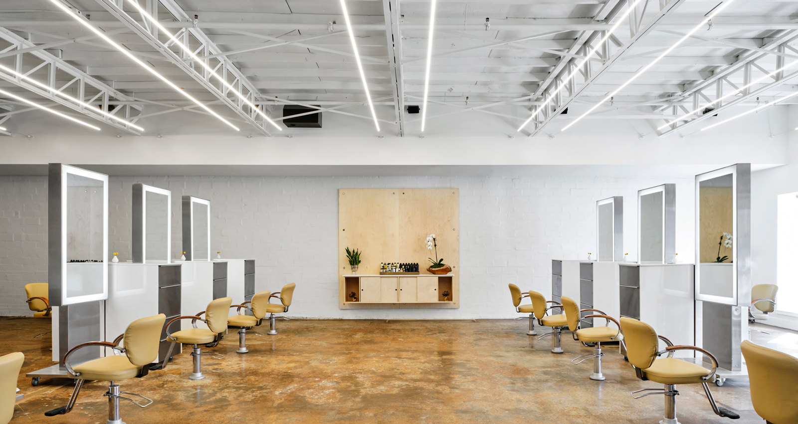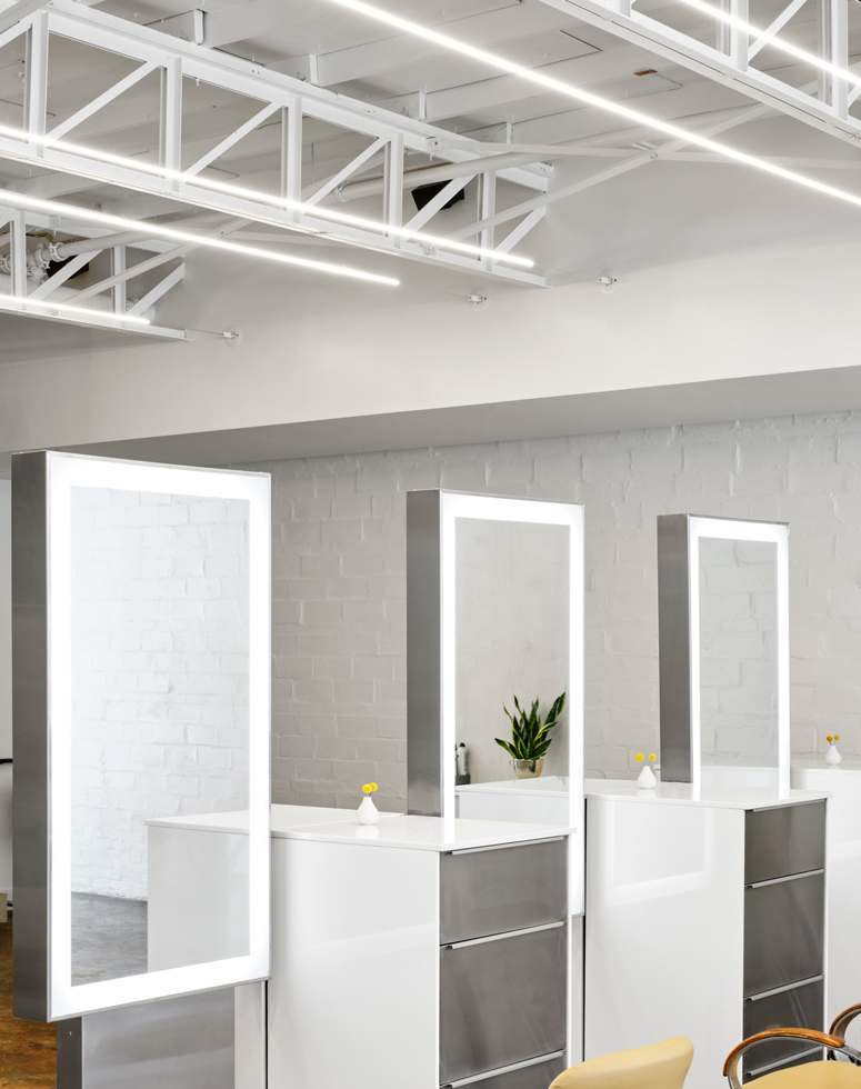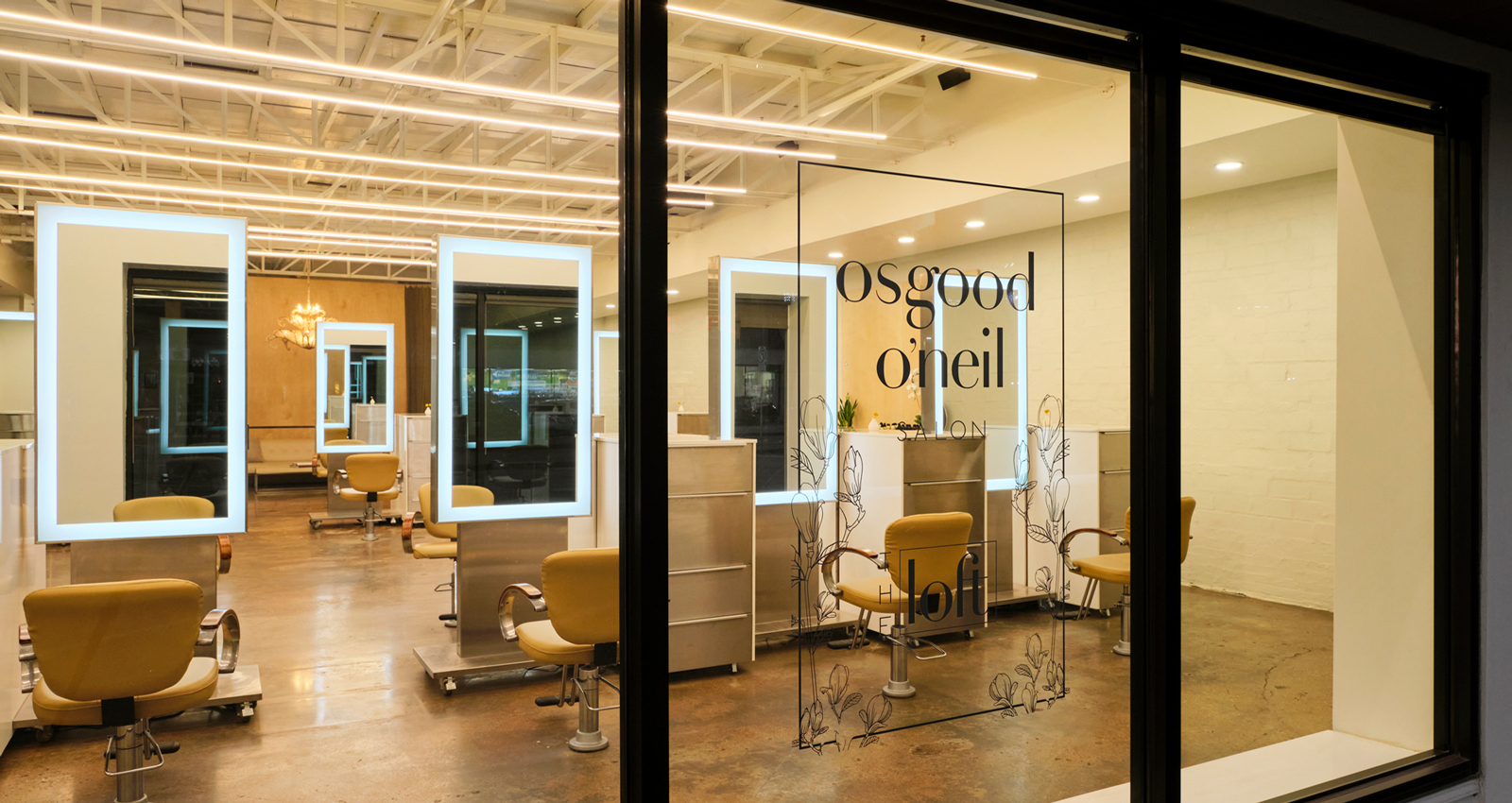 Welcome to the newly renovated Osgood O'Neil Salon, founded in 1998 by Bruce Osgood and Allane O'Neil. This industrial chic space comes to life, thanks to the innovative Lazer Line system from PureEdge Lighting - minimalist lines of light that highlight the environment's unique architectural features and show hair, color, and makeup in the best light possible.