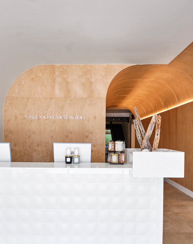 The Osgood O'Neil Salon has trained hundreds of stylists and colorists through its extensive apprenticeship program. Creating zones within the space was crucial to organizing tasks and managing high-volume foot traffic. Spacious workstations feature high-end LED mirrors with plenty of color-accurate lighting, while the moody lounge area makes you feel like you have been transported to a trendy cafe, with matte black fixtures and gold accents.