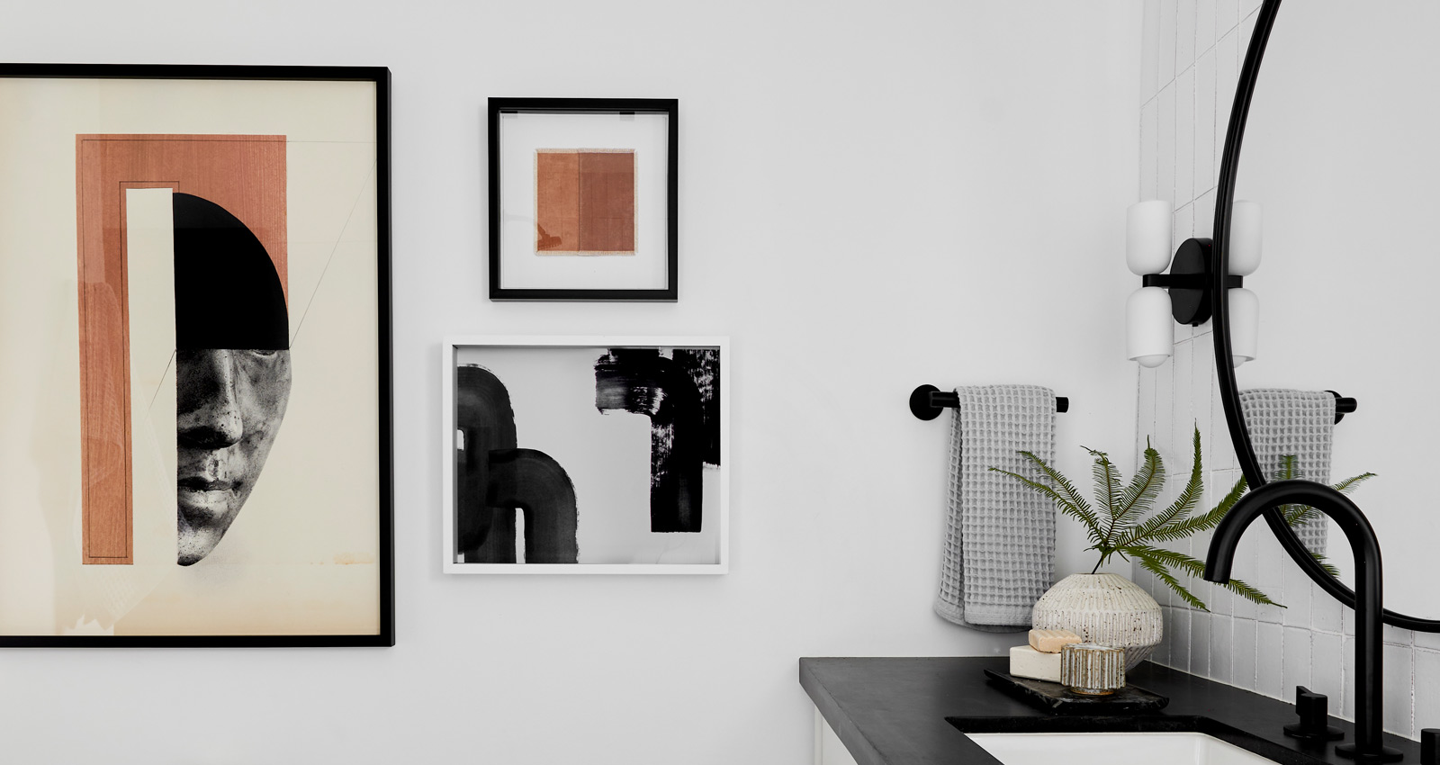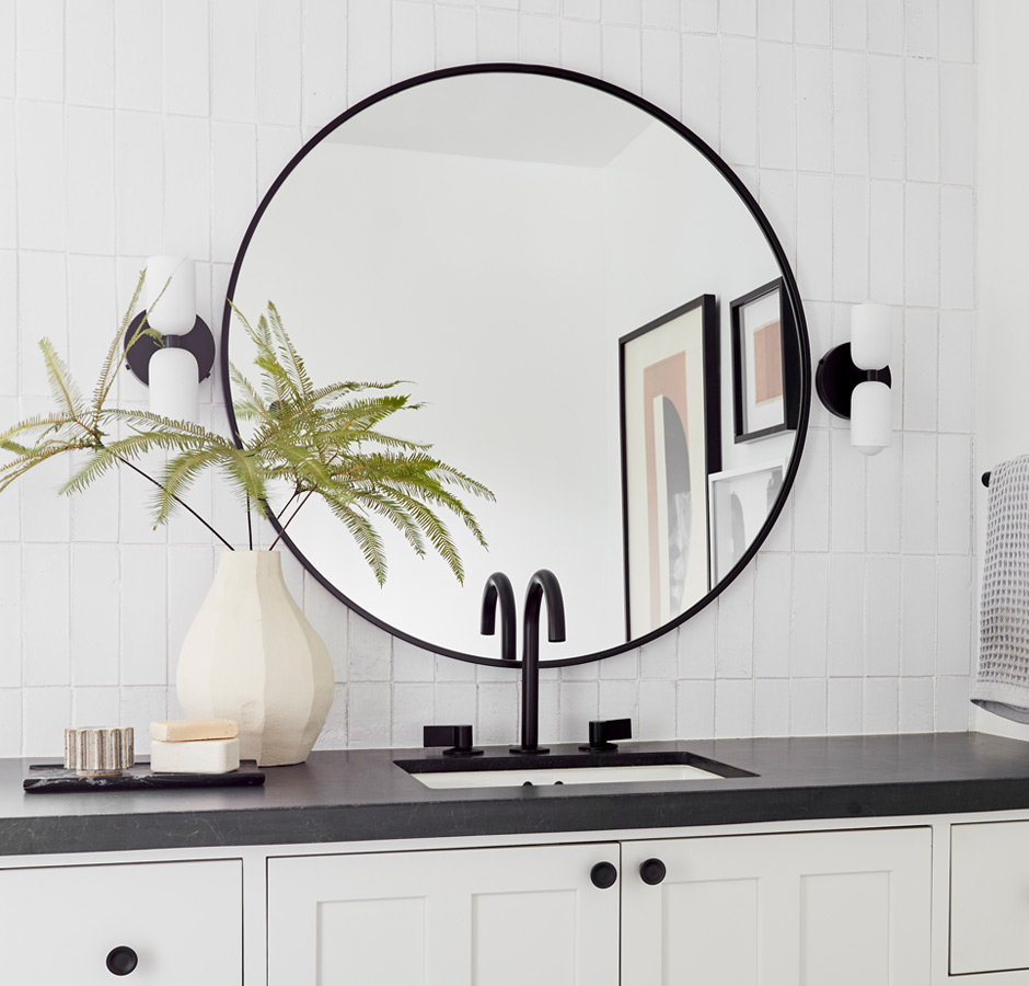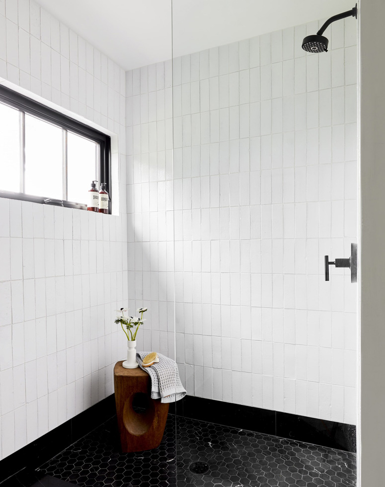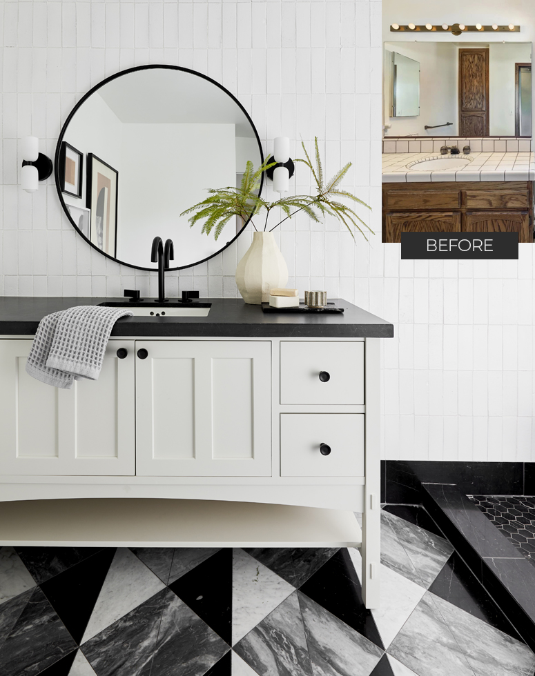 From drab to fab, the bathroom's previous woodsy elements are replaced with crisp, tailored black and white features - minimalist to the eye, but maximalist to the touch. Hand-glossed Fireclay tiles, marble floors, a soapstone countertop and the strikingly simple Glass Up/Down Sconces from In Common With balance the elements of nature in stylish ways, creating a spa-like atmosphere through refined restraint - a signature of Bobby Berk's style.
