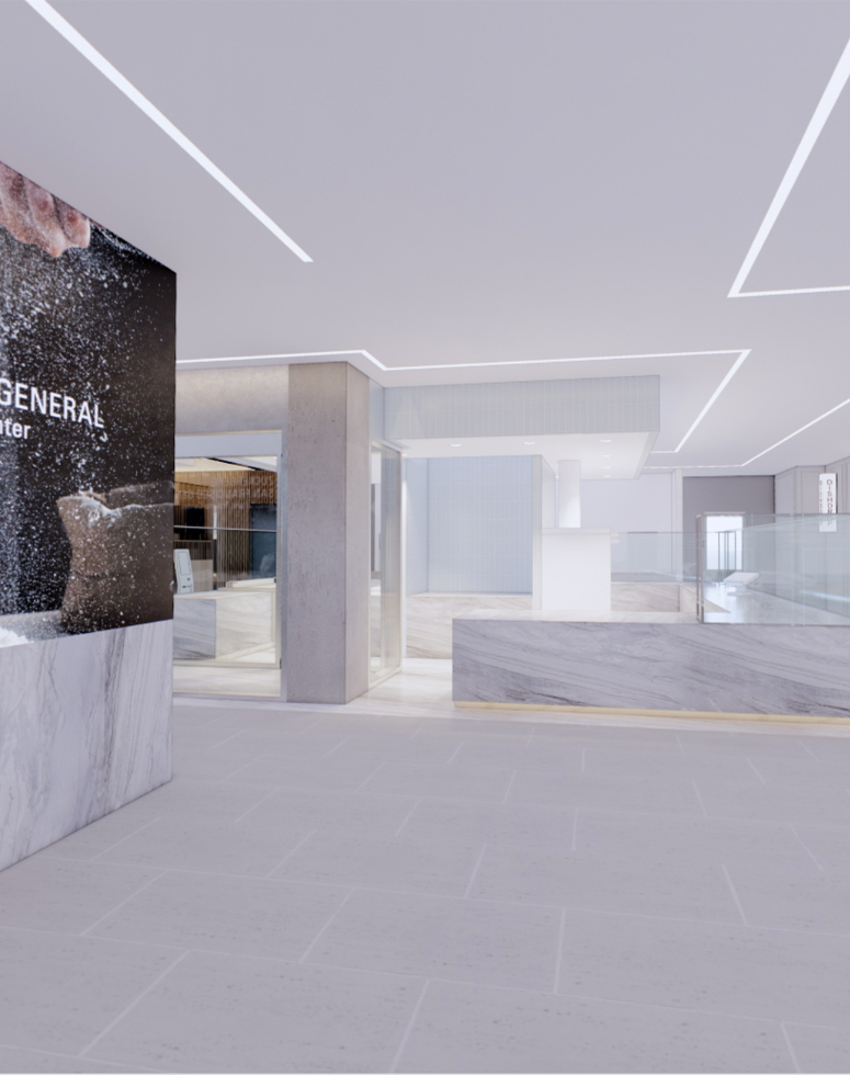 Floor-to-ceiling windows bathe the interior in natural light. They also provide a clear view of the lovely outdoor terrace and herb garden, a veritable oasis for visitors, staff and patients to gather and enjoy some fresh air. Streamlined and serene, this thoughtfully composed space invites everyone to linger, relax and recharge.