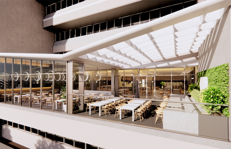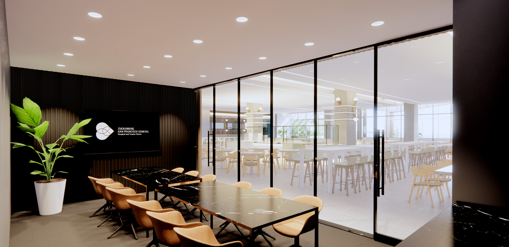 Part of the extensive renovations at ZSFG include a new cafe for hospital staff, visitors and patients. Gordana Jordanovska worked closely with Fidele Bauccio, CEO and Cofounder of Bon Appetit Management Company, as well as her core team to design a healing environment for people to relax and recharge. Her concept envisions spacious interiors and welcoming outdoor spaces that promote everyone's well-being.