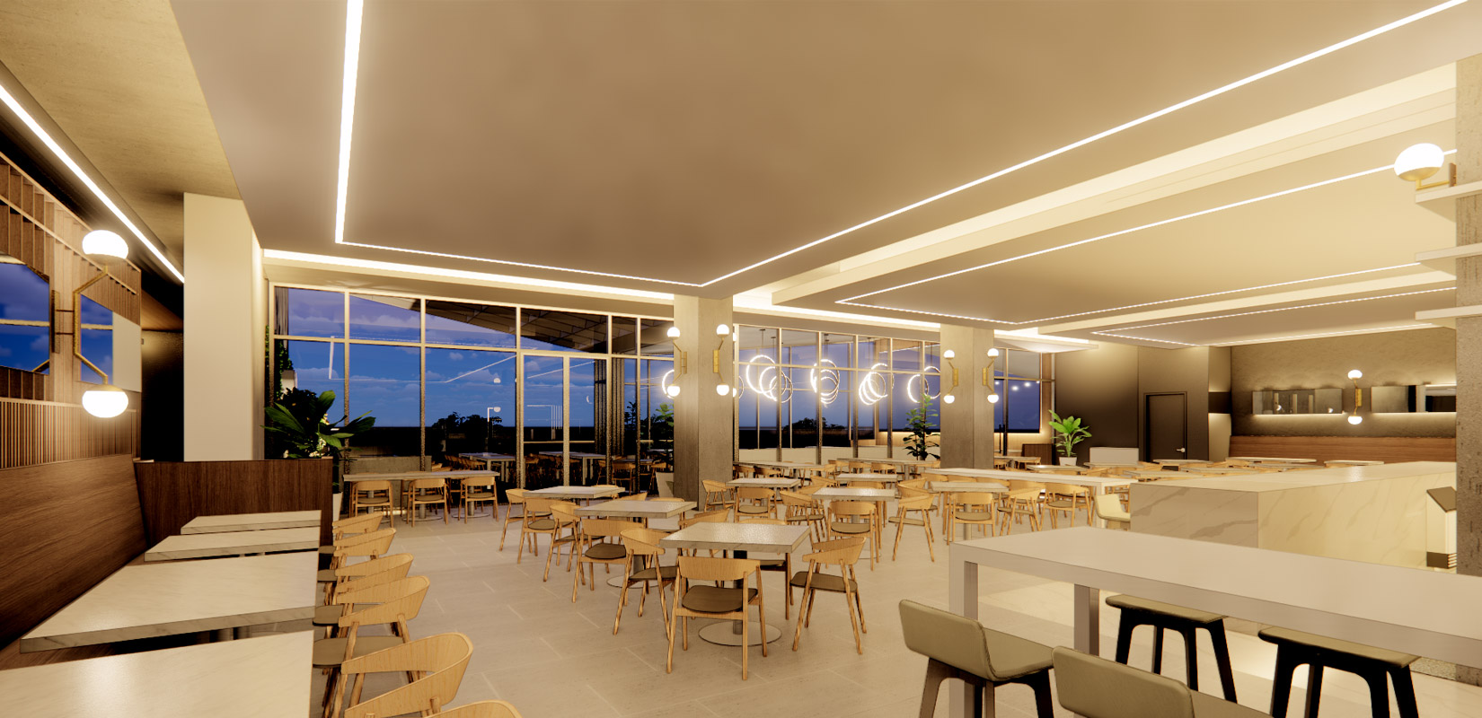 The renderings for this state-of-the-art facility reveal Gordana Jordanovska's unconventional approach. Carefully chosen fixtures like the halo-shaped pendants in the airy "Heroes Lounge" complement the strong architectural lighting, bringing emotion to the space.