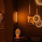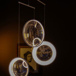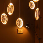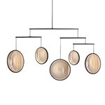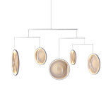 The Focus Chandelier is inspired by soap bubbles traveling through space and time. It features a collection of luminous Acrylic discs hung by a White or Black Aluminum frame. Dimmable with TRIAC dimmer.