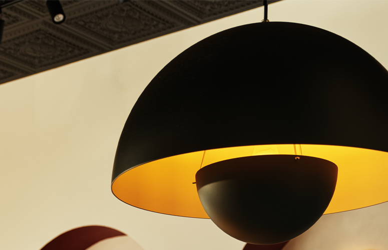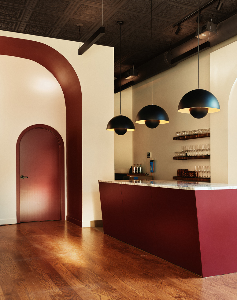 A bold line of iconic Flowerpot VP2 Pendants from venerable Danish design house &Tradition hangs above the bar, enhancing the vintage feel of the space. Created by Danish design legend Verner Panton in 1968, these simple, yet elegant lamps represented a major break with convention at the time. Modern and minimalistic, the black Ramen Wall Sconces above the shelves of wine punctuate each arch with mod effect. The bold black statement lighting artfully accentuates the cream and crimson colors throughout the room, striking the perfect balance.