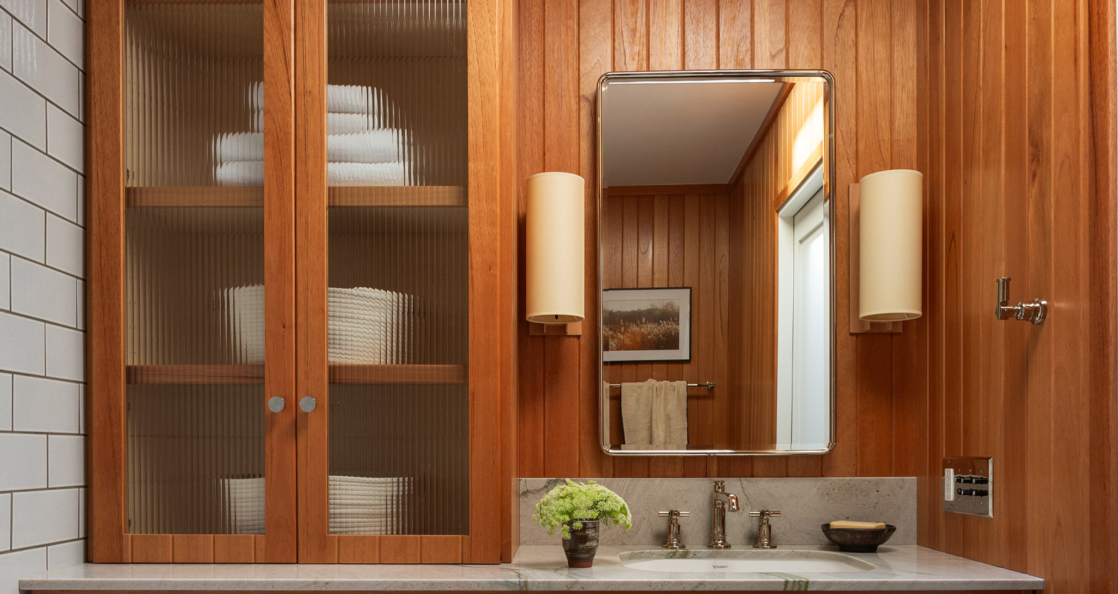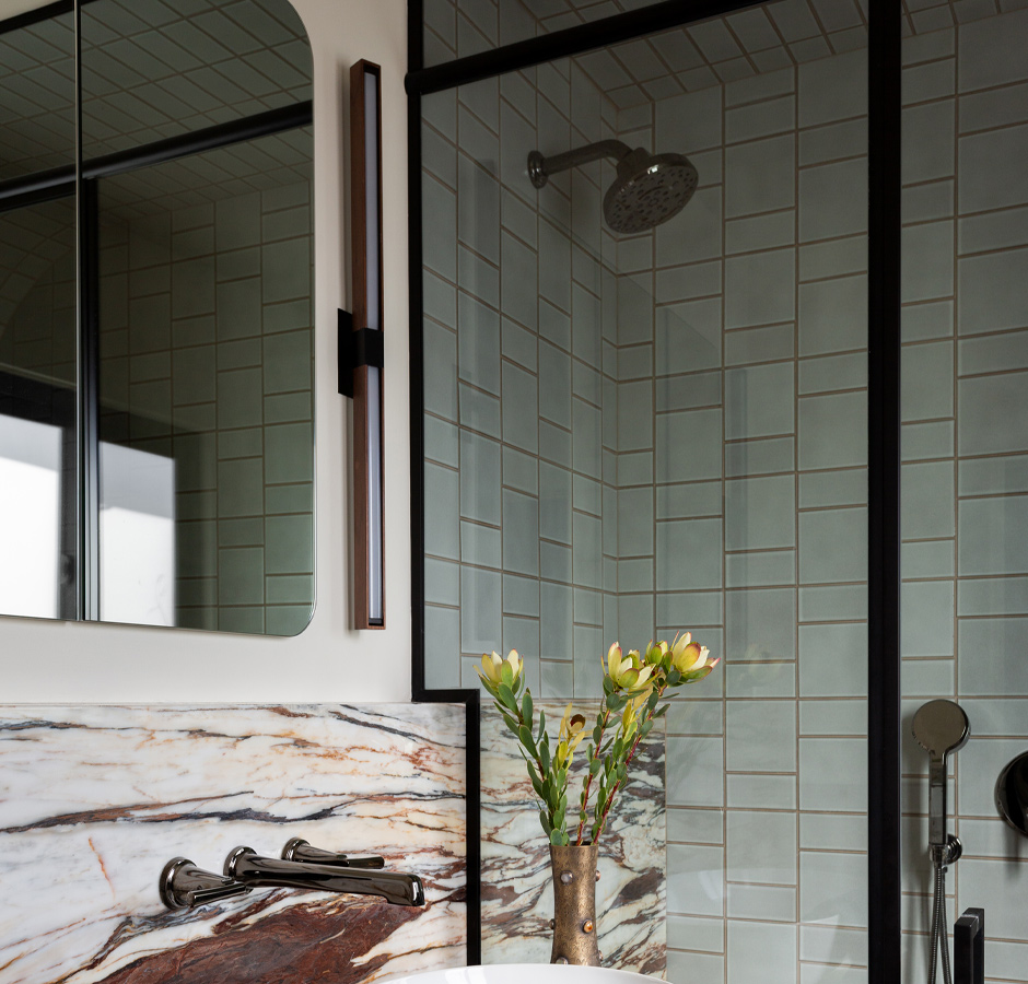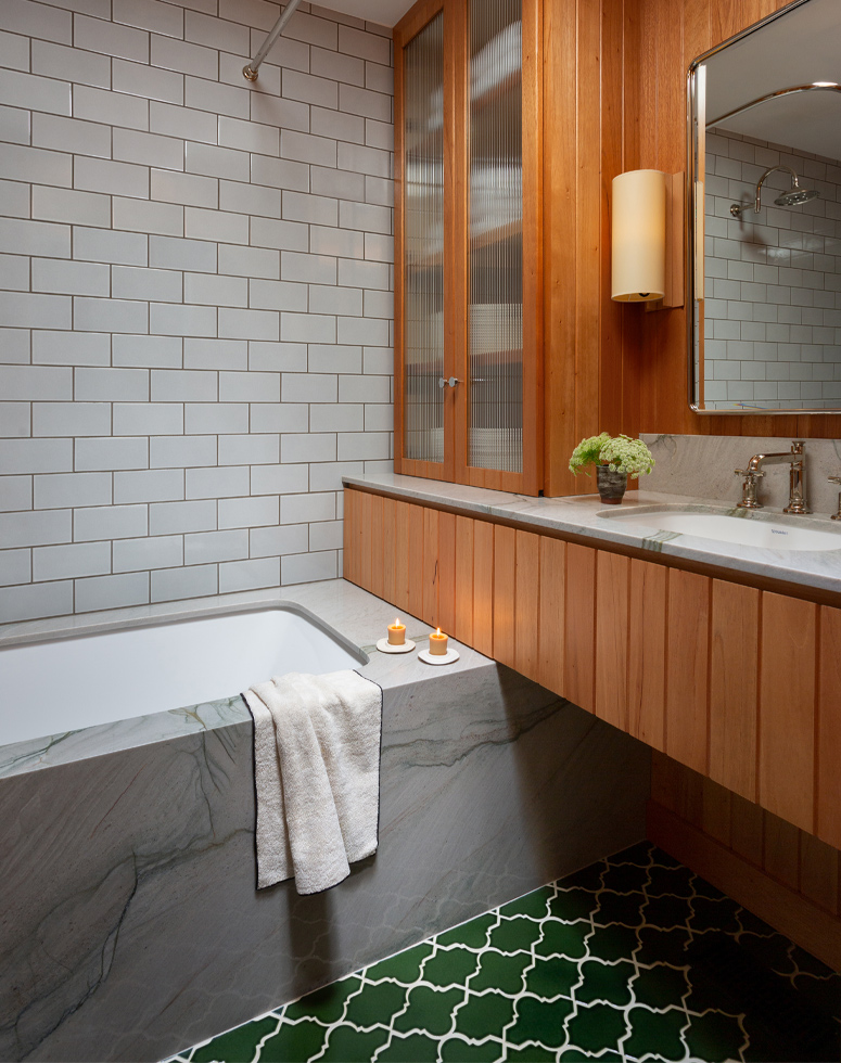 The secondary bathroom offered enough room to accommodate Lamb's request for a bathtub. Wrapped in warm cedar with contrasting deep green patterned tile, this sanctuary feels like an oceanside retreat. Providing gentle light here are the TMM Largo Wall Sconces, featuring cylindrical parchment shades that lend a rustic note.