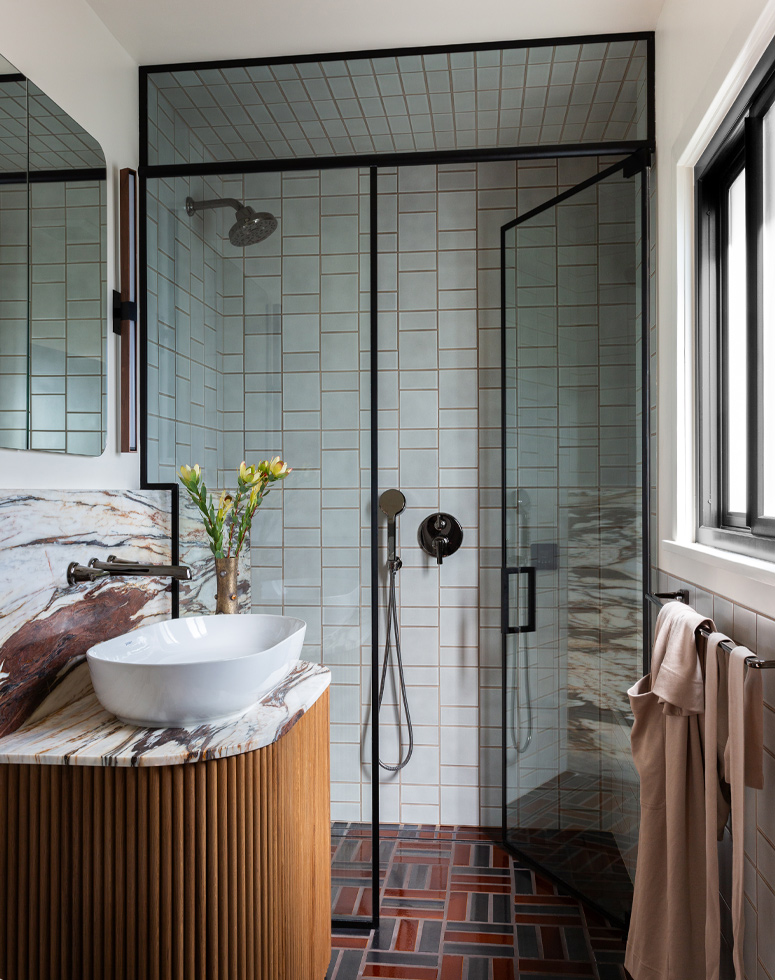 The idea behind the entire home renovation project was to create a "favorite hotel" feel throughout - and the bathrooms beautifully achieve this aim in their own unique ways. The primary bathroom has an avant-garde feel rich in contrast and drama. The fluted oak vanity adds texture and is almost pedestal-like, showcasing the minimalist washbasin above. Framing the mirror are the streamlined and versatile Tie Stix Wood Linear Adjustable Wall Lights from PureEdge Lighting.
