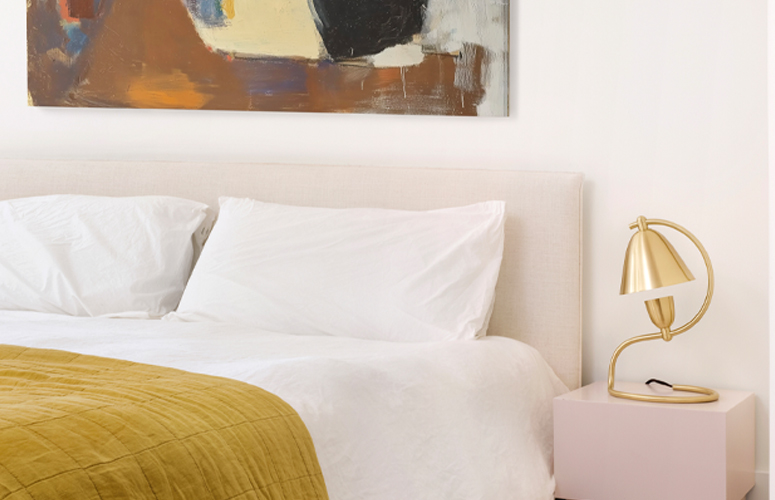 Iconic table lamps provide eye-catching accents in various rooms throughout the home. A favorite of the owner, the Shogun Lamp by Mario Botta for Artemide is a much-elevated replacement for a plain white lamp. Sculptural and tasteful, the Klampenborg Table Lamp graces a modern bedside table. And the chic, geometric Orsay Table Lamps complete the guest bedroom.