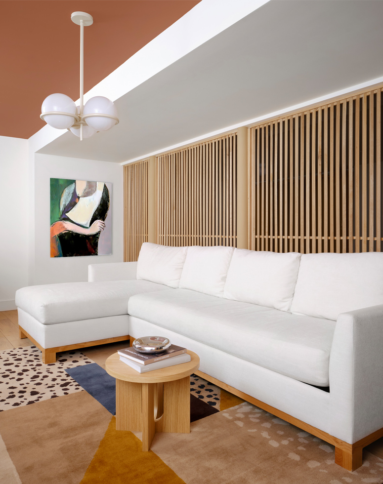 The home also gained distinctive overhead lighting, like the Art Deco-inspired Era Chandelier from Ferm Living that brightens the finished basement. The black frame of the minimalist Nido Chandelier coordinates beautifully with the details in the kitchen. From room to room, beautiful and purposeful lighting makes all the difference.