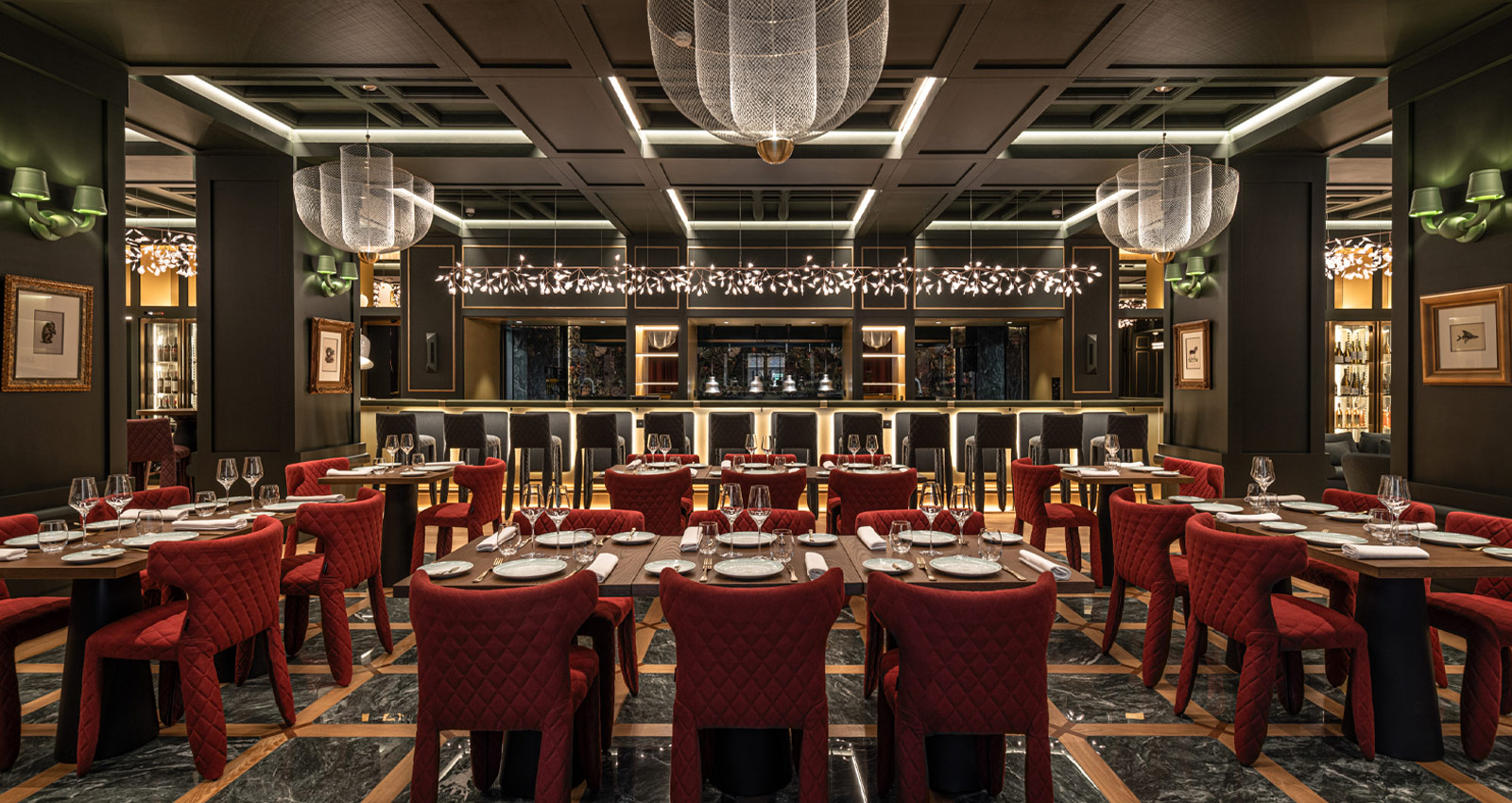 The ethereal Meshmatics Chandeliers float above the tables in the stunning restaurant. Various manifestations of the nature-inspired Heracleum III Suspension - from the linear suspension in the restaurant to the oversized circular chandelier in the adjacent seating areas - provide graceful ornamentation and gentle, diffused lighting. The avian Perch Floor Lamps and Perch Wall Sconces bring whimsical charm to the bedrooms, each designed in their own vibrant color scheme.