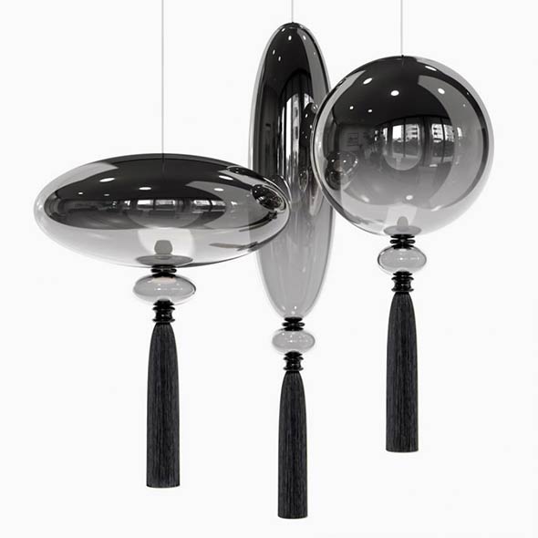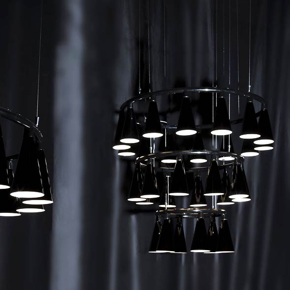 Otherwise known as “the black bat”, the Komori chandelier is reminiscent of a colony of bats suspended upside-down. Featuring glass shades casting light downward, it creates unique patterns and visual interest. Bases can be connected to create large or small colonies.