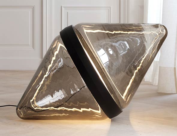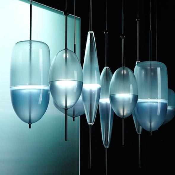 Tamura took inspiration from the blue-green hues and the glistening reflections of the Venetian lagoon to create Flow(t). At a glance, the pendants appear both submerged and exposed, a symmetrical reflection reminiscent of a waterfront cityscape. Designed for versatility, each pendant can stand alone or be grouped for a structural display.