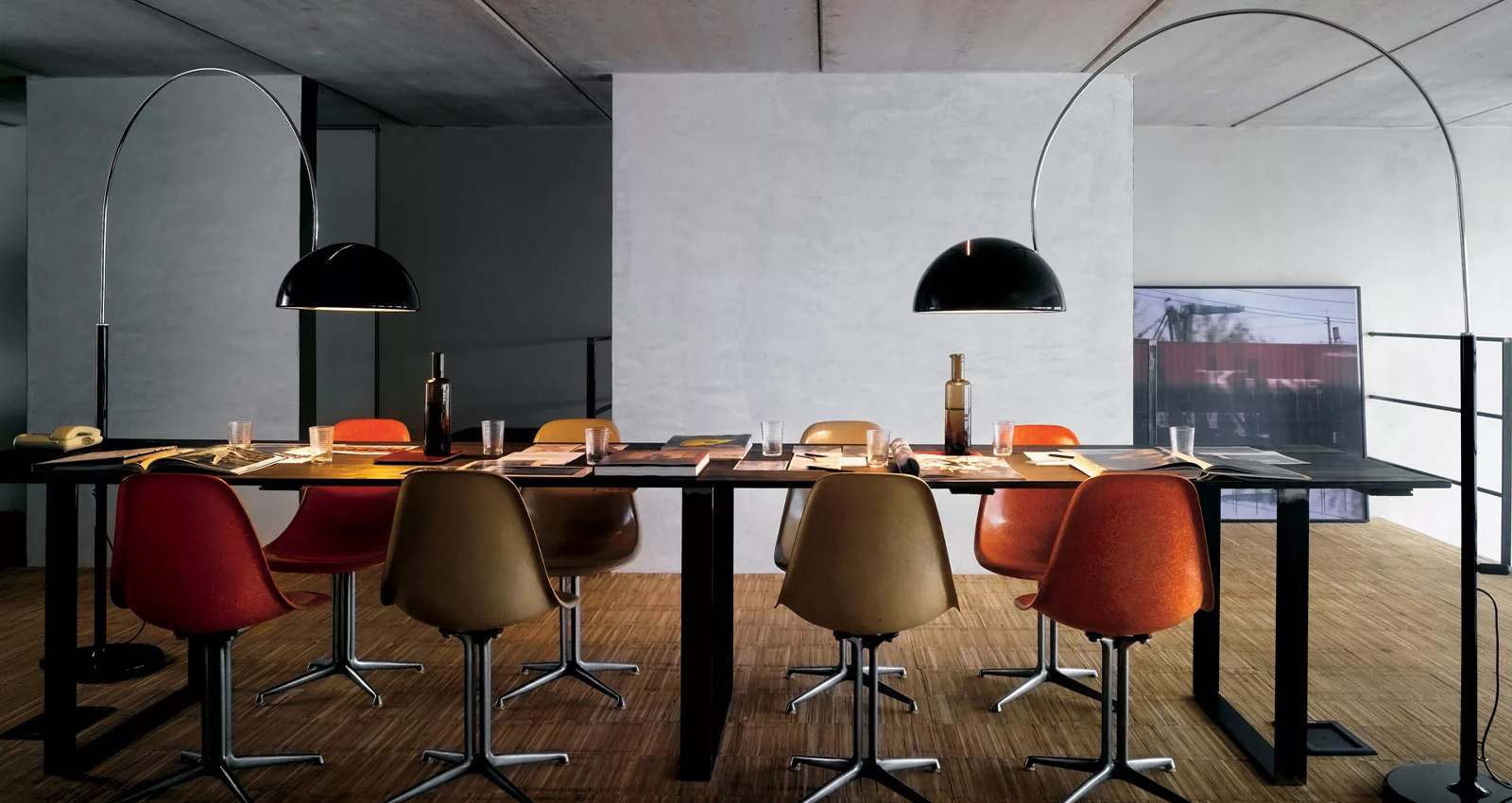 The Coupe series was inspired by the Spider Floor Lamp Colombo designed for Oluce in 1965. It has the same fire-painted metallic base and delicate chrome stem as its popular predecessor. But the clever plastic mechanism that connects the stem to the lamp's aluminum head is an innovation that makes Coupe more versatile and functional. It allows the reflector to be tilted, rotated and adjusted in height, casting light in several directions.