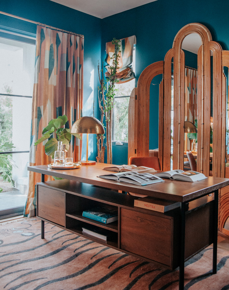 The cubist-inspired home office introduces darker tones to the otherwise sun-drenched pastels. The vintage mirrored screen, modern wooden desk, hammered metal table lamp and woven rattan floor lamp exude a handmade touch that feels extra vintage. The mix expertly balances old world glamour with artful, seaside flair. In the guest bedroom, pastel greens and rich browns draw upon the sand and surf - a perfect backdrop for the natural brass Happy Table Lamp.