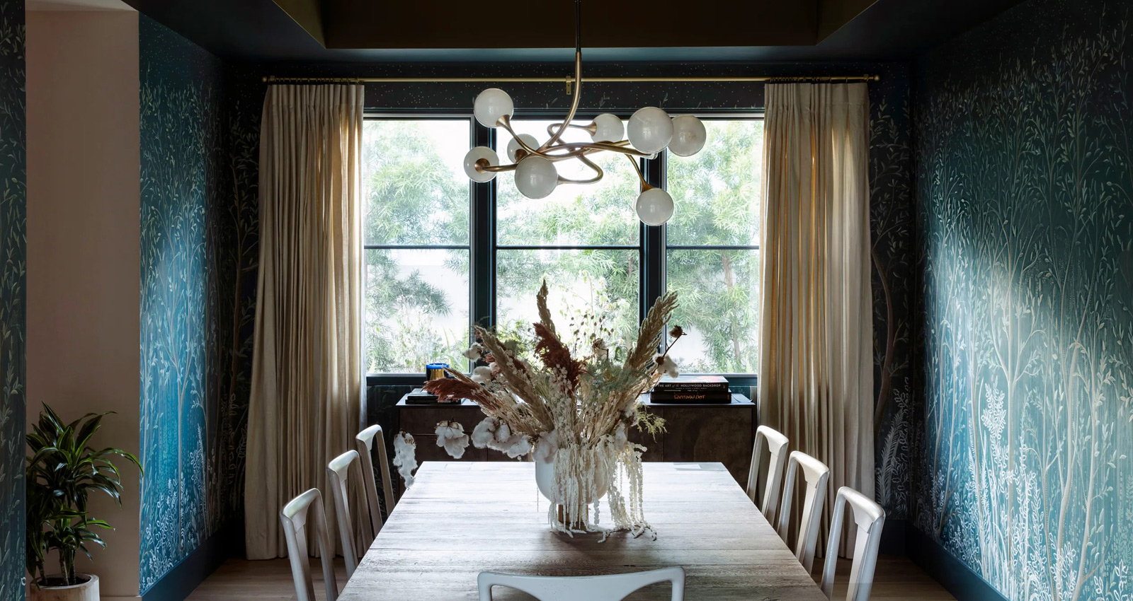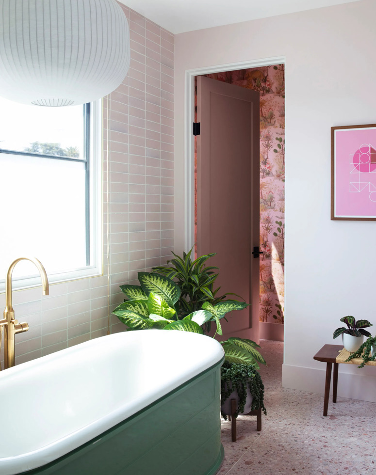 In a sea of pastels, high-contrast textures and patterns mix things up - offering a visual break in the tone-on-tone spaces. Toile- and mural-style wall coverings, terrazzo floors, striking marble - each piece has its own tale to tell. "Bryce and I share a passion for old Hollywood storytelling," Thomas says. When it all comes together, the result is truly cinematic.