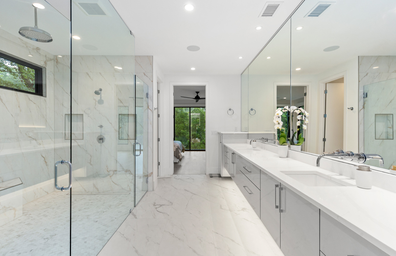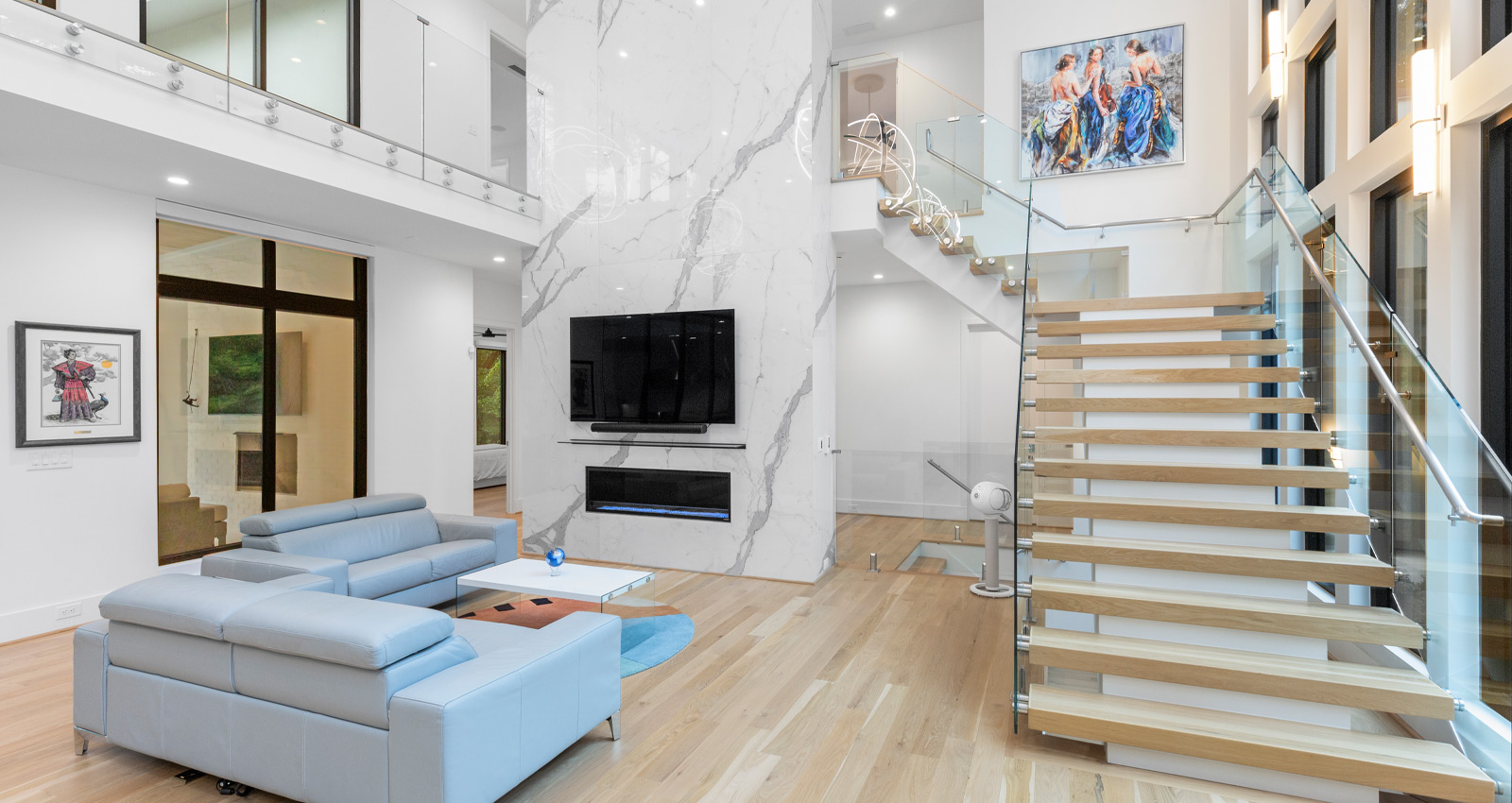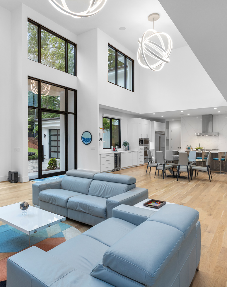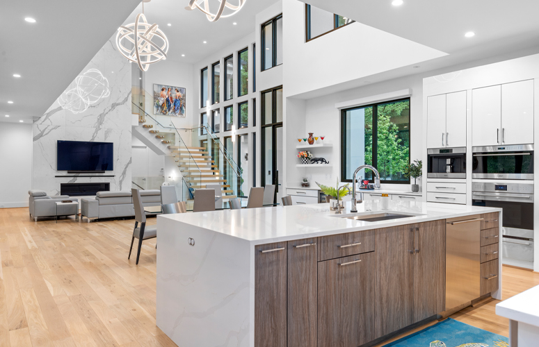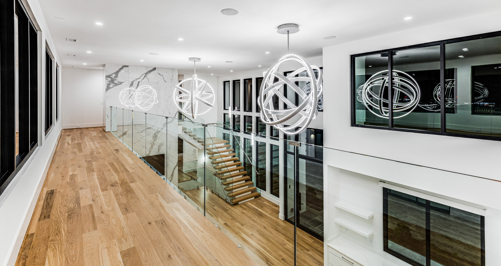 Suspended over the great room are two showstopping chandeliers that reflect off the marble and glass surfaces around them with stunning effect. Reminiscent of a gyroscope, the Kinetic Chandelier by Modern Forms is made of brilliant edge-lit LED panels with silicone diffusers that emit 360 degrees of seamless, even light.