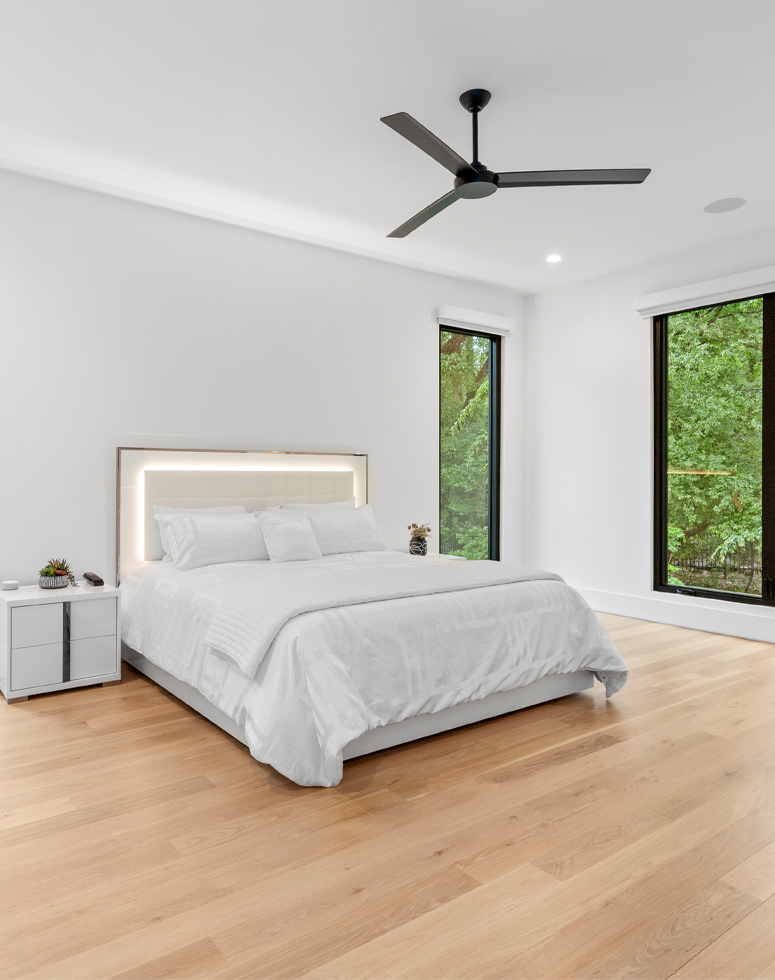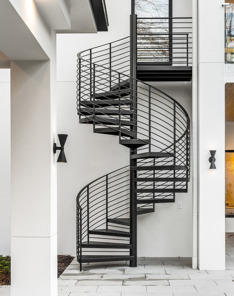 This spacious seven-bedroom, five-bathroom home was conceived by architect David Doran and built by Deane Johnson. Clean lines and strict geometry define every space. The consistent use of white and black accents, fixtures and lighting, like the Albertine Outdoor Wall Sconces, create striking contrasts both inside and out.
