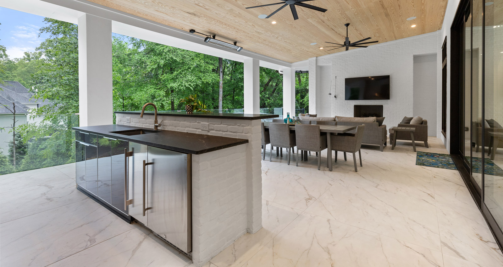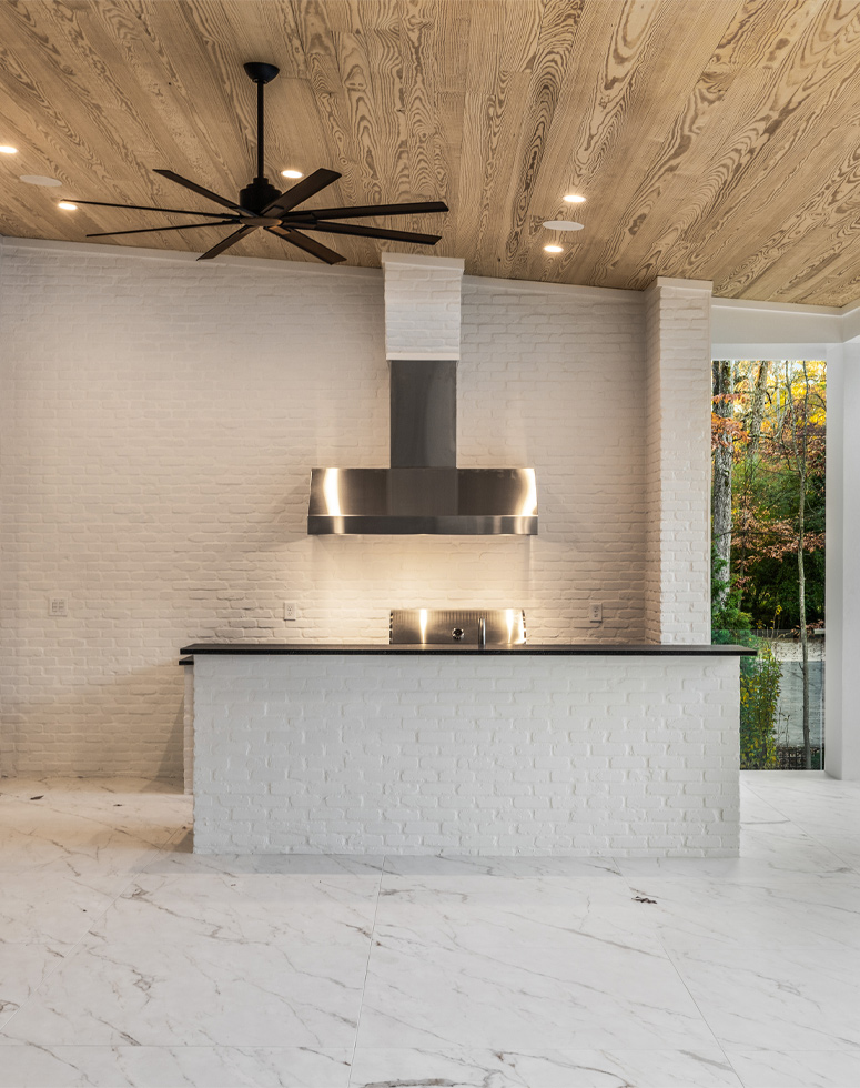 Multiple outdoor spaces grace the rear of the home, providing access to the pool and the 1.1 acres of beautifully landscaped and wooded land surrounding it. The stunning second-floor terrace features a complete outdoor kitchen, television and plenty of space for entertaining. The Xtreme H2O Ceiling Fans overhead are an essential addition to keep everyone comfortable.