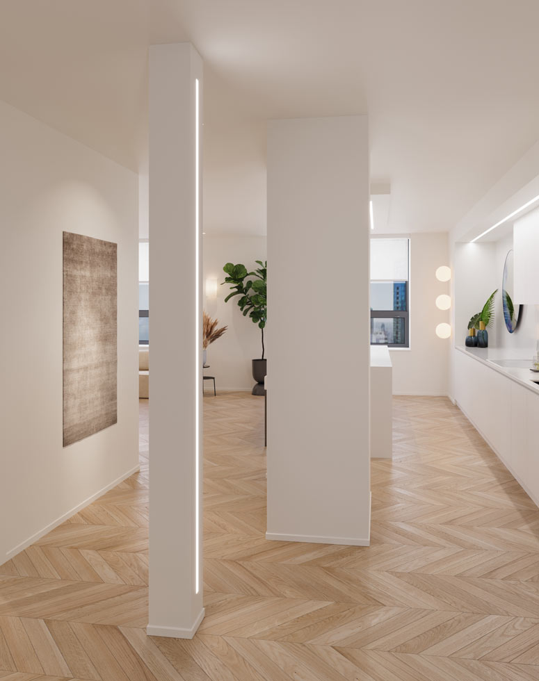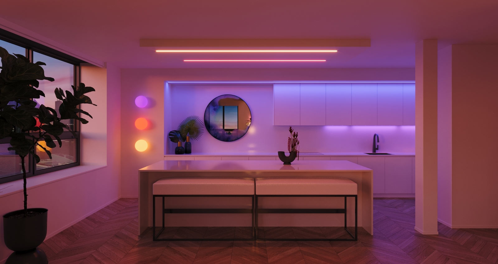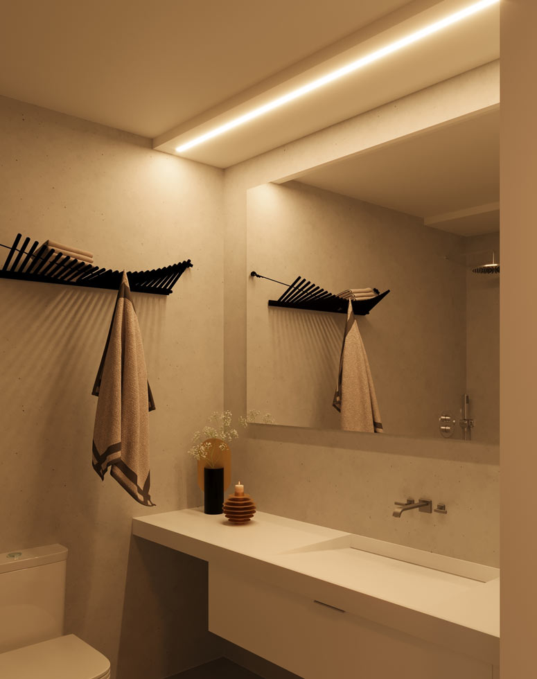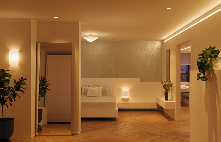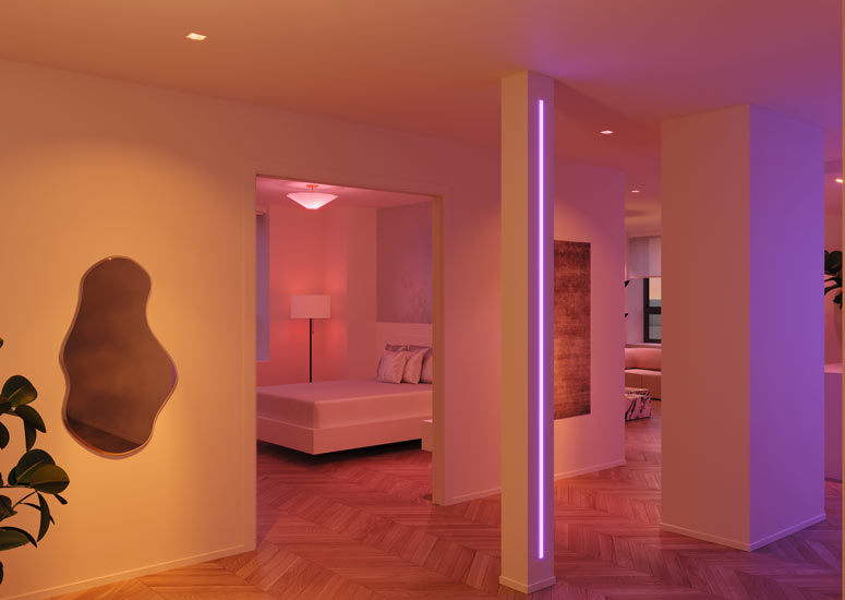 As day turns to night, Pure Smart RGBTW technology takes center stage. Color-changing wall accents and tunable ceiling illumination set the tone for entertaining or unwinding. In the hallway, a vertical run of TruLine transforms a structural column into a sculptural moment, emphasizing intention over ornamentation. The bedroom continues the layered approach, where low-glare sconces and a discreet line of TruLine near the ceiling create a calm, focused atmosphere.