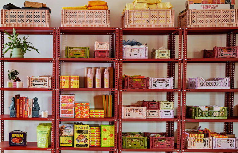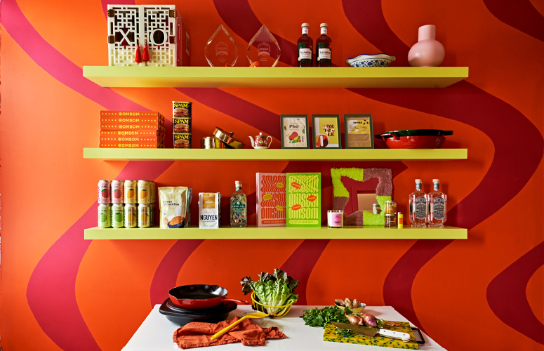 Launched in May 2020 by sisters Kim and Vanessa Pham, Omsom makes premixed pantry staples to help home chefs replicate their favorite Asian meals without struggling to source hard-to-find ingredients. The company's name comes from the Vietnamese phrase "om som", meaning rowdy or rambunctuous. This fun, vibrant energy is found in the eye-catching colors, distinctive furnishings and carefully curated lighting throughout their office space.