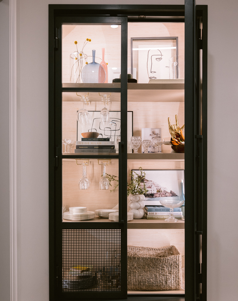 Decorative cabinets in the kitchen and dining areas feature integrated lighting that enhances both functionality and display, allowing them to turn off the overhead cans and create beautifully highlighted spaces.