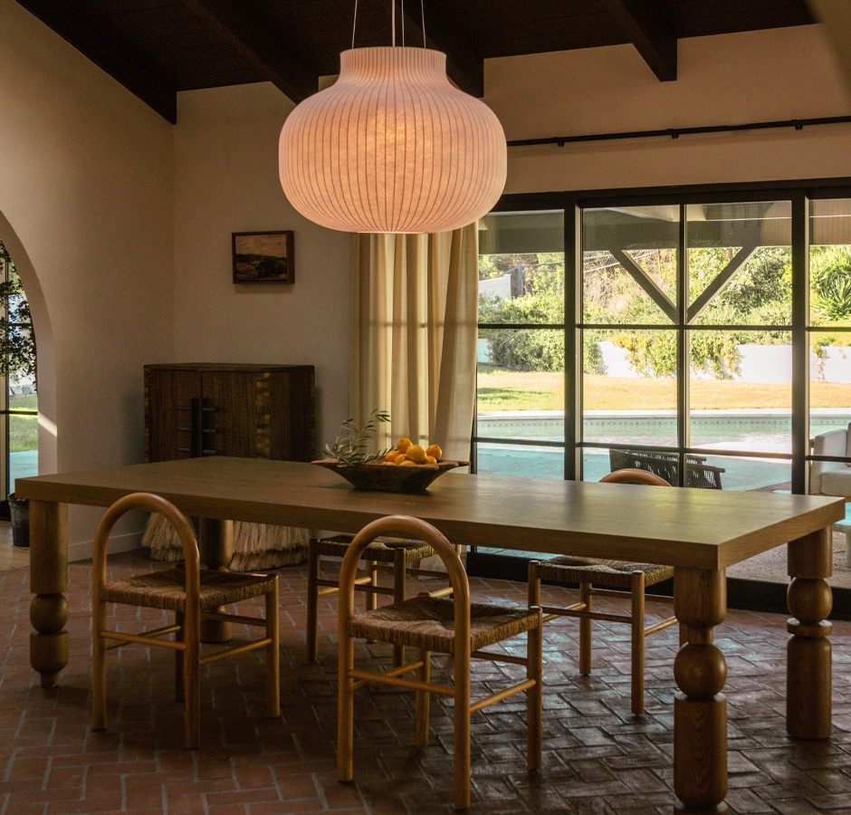 Spectacular in its simplicity, the Strand Onion Pendant provides gentle, diffused lighting in the dining room. Sculptural, yet subtle, the Fishbone Floor Lamp pairs effortlessly with the modern furnishings in the beautifully curated living room. The Maia Floor Lamp with its perfectly imperfect ceramic base brings natural texture and elegance to the cozy family room. Eclectic and personal, this remarkable home transformation is a veritable triumph of vision and intention.