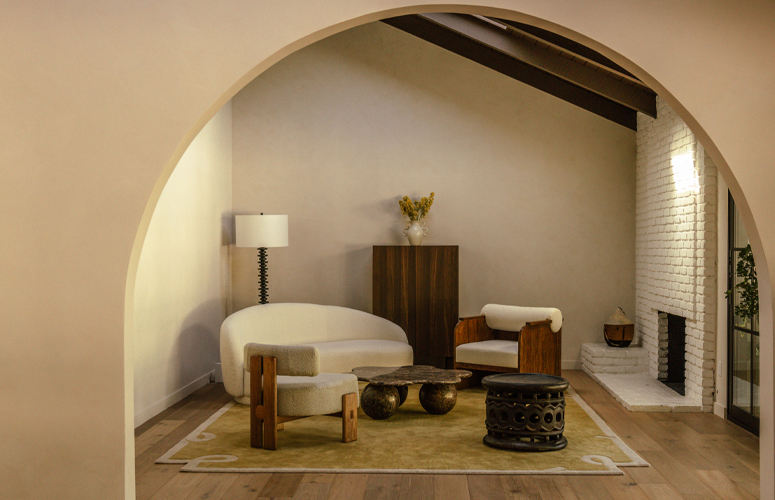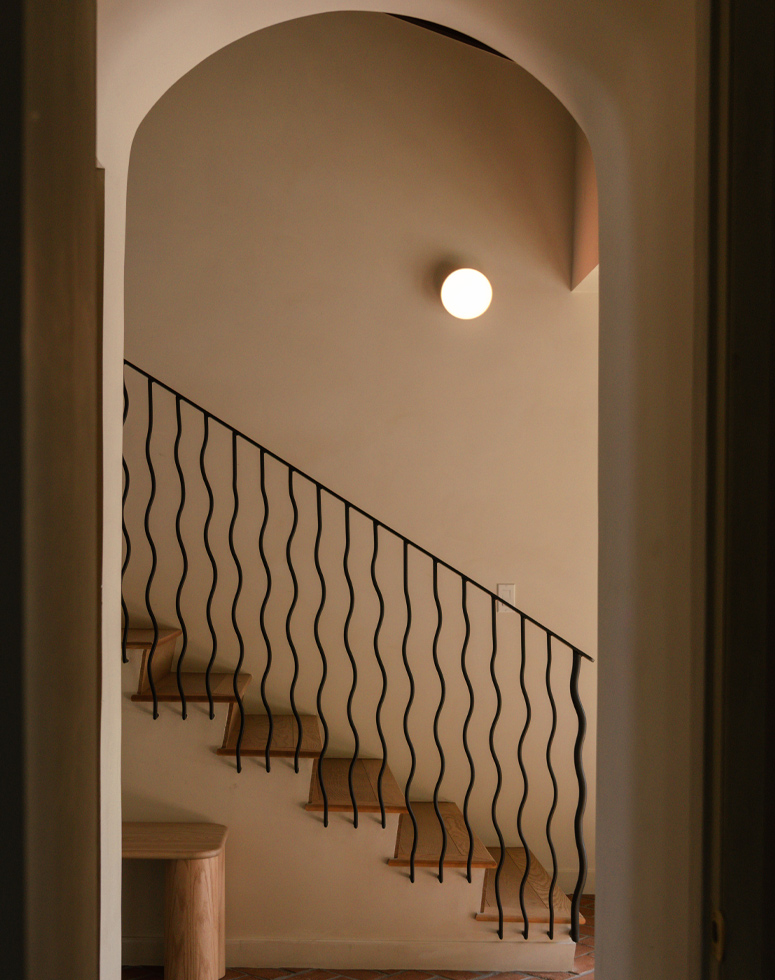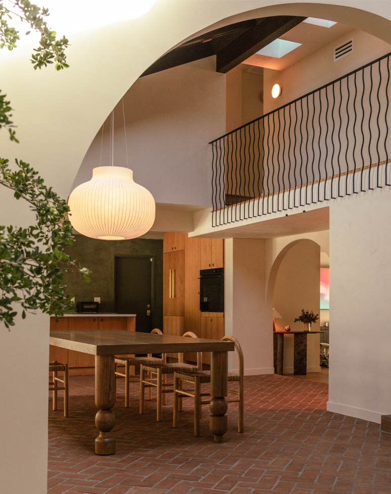 The couple transformed most of the interior doorways to create arches in place of corners. Handmade brick sourced from Tijuana graces the entryway, kitchen and stairs. Warm hardwood floors replace the existing tile, carpeting and faux wood flooring in the other rooms of the home. A distinctive wrought iron railing elevates the staircase, with minimalist Glaze Wall Sconces by Arteriors Home shining on the walls above.