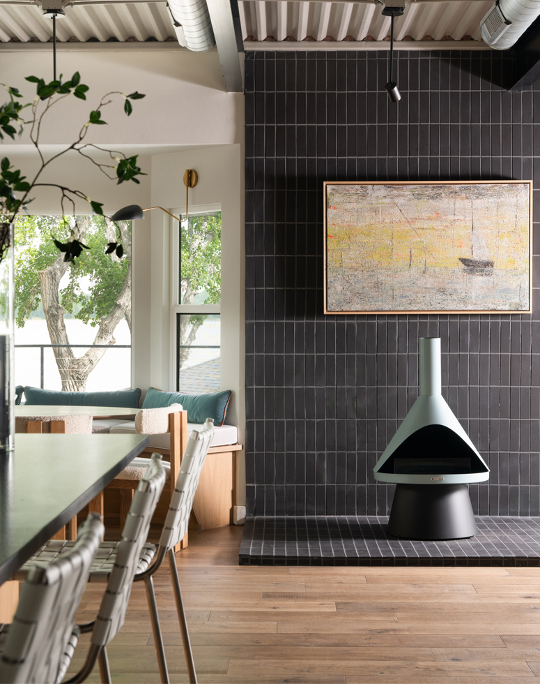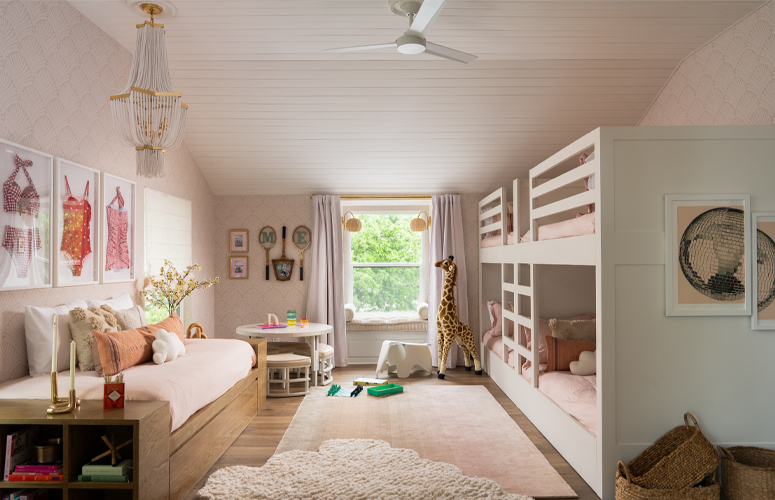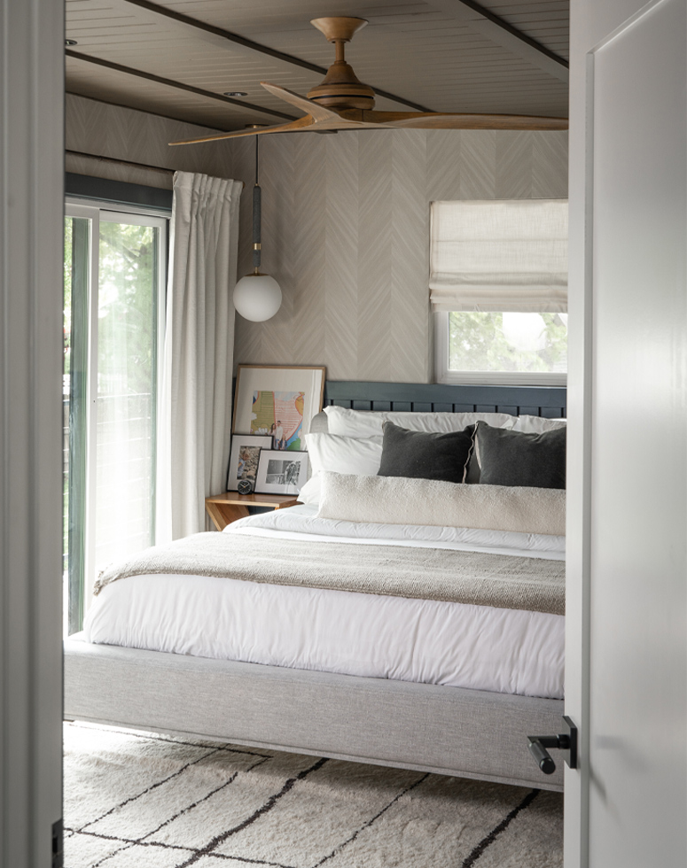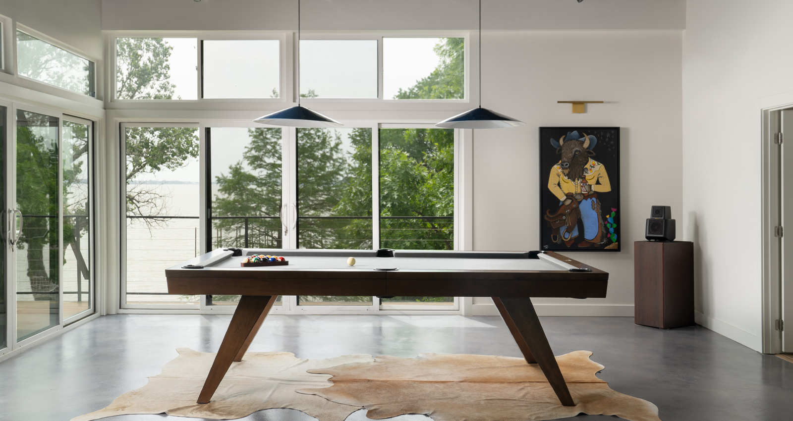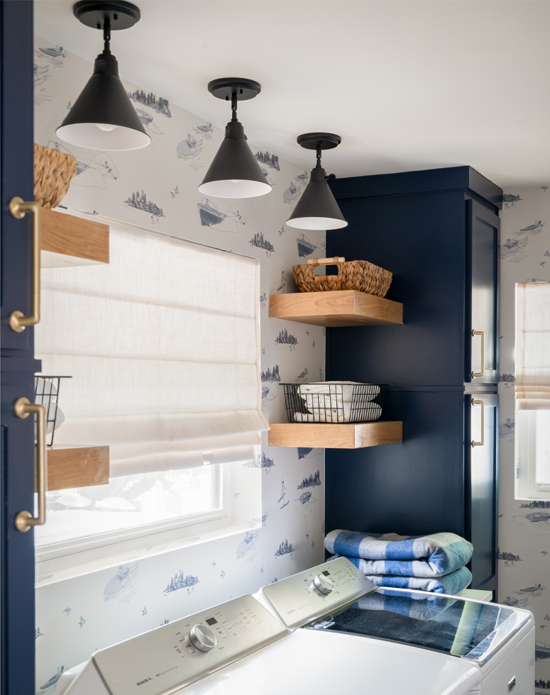 The designers aimed to incorporate mid-century modern fixtures and accents throughout the finished home. At the same time, it was important to create a space where the entire family would feel comfortable. The lakeside setting inspired the design and accents in many rooms, like the wallpaper and Arti Pendant lighting that elevate the charming laundry room. It also posed another essential requirement: As a lake house, the furnishings needed to be durable enough to hold up after fun outdoor activities.
