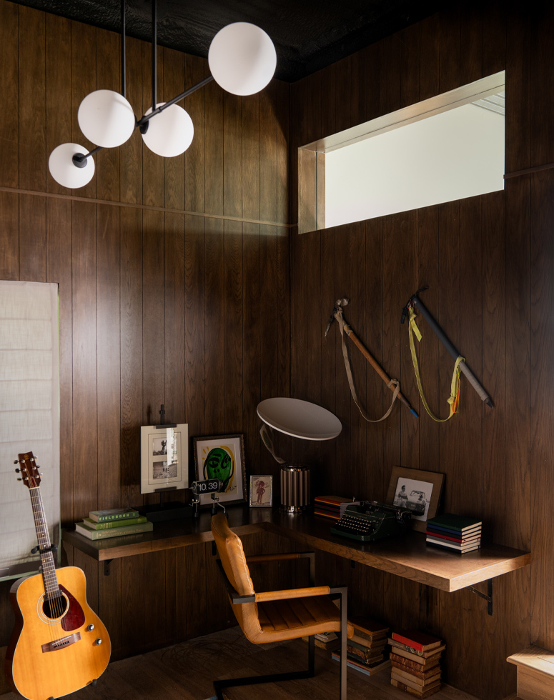 The office is a space of quiet sophistication. Warm wood panelled walls and carefully chosen antique details combine to create a calming space for focus or relaxation. The decor reveals the current and former owners' shared interest in antique cars and mountain hiking. The iconic Taccia Table Lamp by FLOS adds warm, diffused light with an industrial edge. The Cassia Linear Pendant floats overhead, putting a modern twist on a mid-century design.