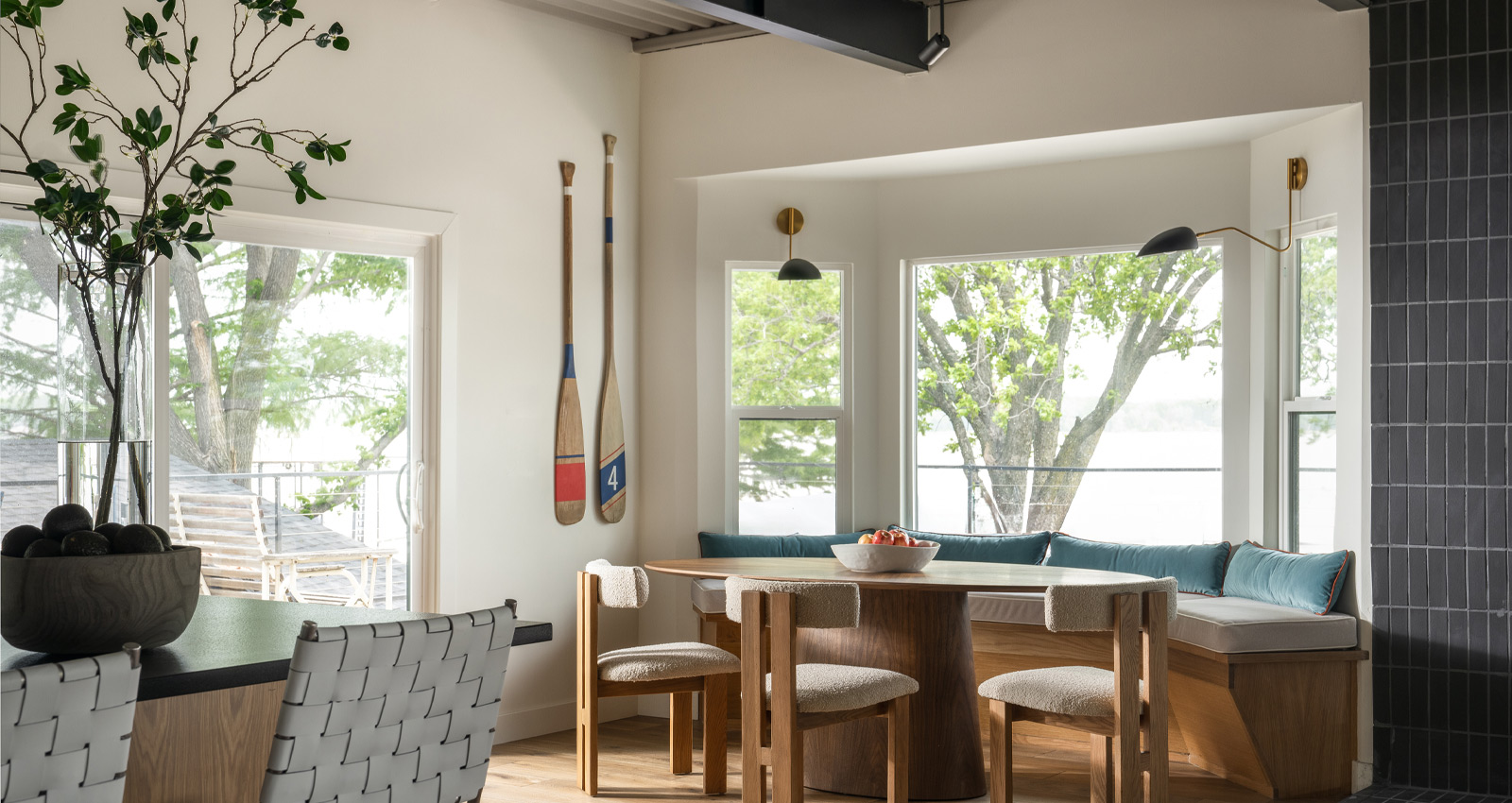 Lighting is layered beautifully throughout the lakehouse. Overhead lighting like the Barclay Ceiling Lights brighten the space with warm ambient light. Strip lighting defines contours and elevates the bathroom with a contrasting glow. Targeted accent lights like the Mona Picture Light highlight artwork and decor moments. In the kitchen, the nautical Mercer Wall Sconces radiate from above. Gorgeous wall sconces, floor lamps and table lamps throughout the home cast effective task lighting where needed. Like the lovely Jane Wall Lights, which illuminate the dining table without taking away from the stunning lake view.