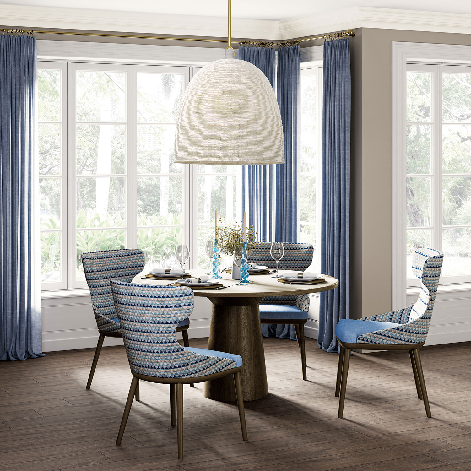 To improve your dining room décor, use dimmers with your chandeliers, pendants or ceiling lights to create a more comfortable space and reduce glare over the table. For an eco-friendly lighting solution, warm dim LED fixtures and LED bulbs save energy while offering the same comforting, amber glow of halogen and incandescent light sources when dimmed. Be sure that all fixtures have their own dimmers that match the bulb types and/or power supplies.