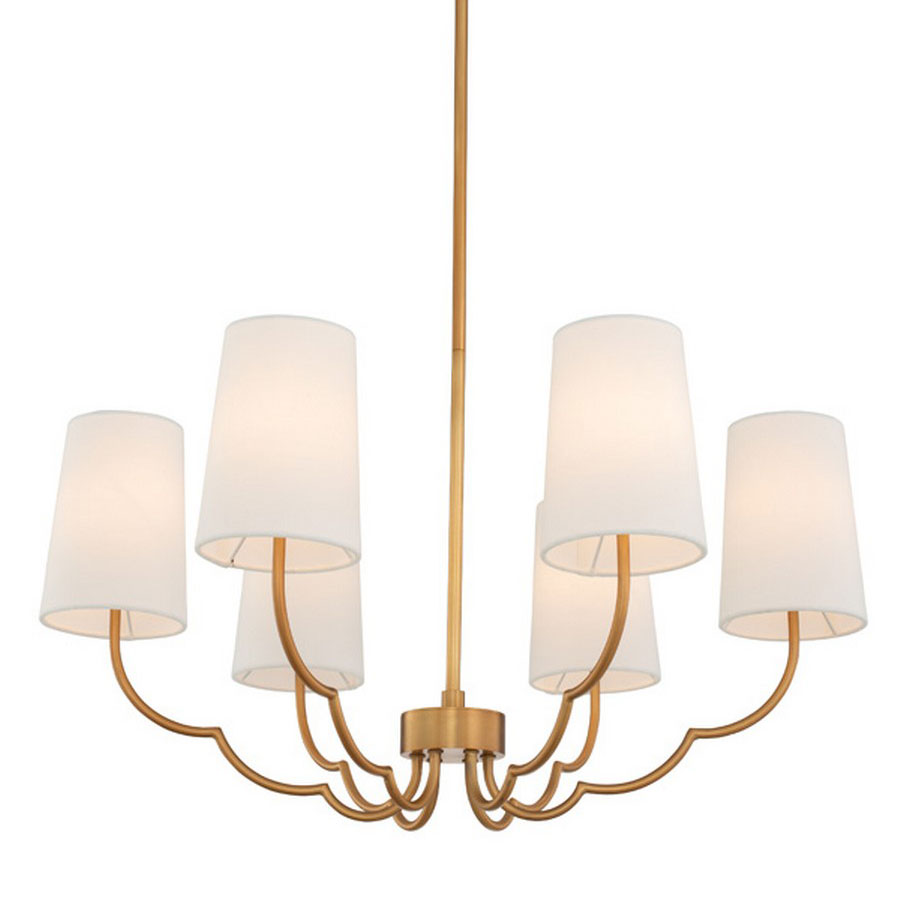 The Sophia Chandelier features a Metal structure and cone shaped Fabric shades. Available with a New Brass finish complemented by White shades. ETL listed for damp locations.