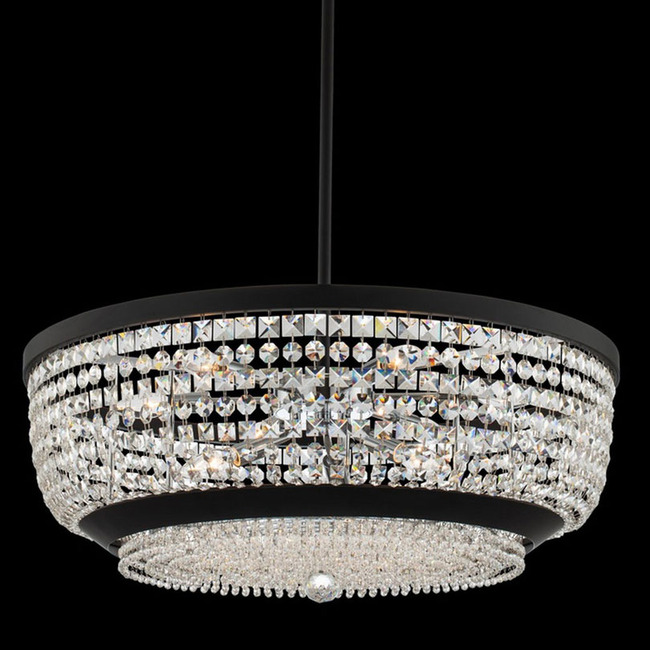 The Terzo Pendant features Firenze Clear Crystals forming a round basket shade. Features a structure with a Matte Black finish and Polished Chrome accents. ETL listed.