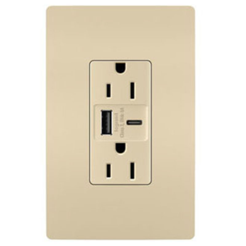 The Ultra Fast USB Port and 15 Amp Tamper-Resistant Outlet allows user to charge devices up to 40% faster with 27 watts of power supplying the USB Type-A and Type-C connections and features a tamper-resistant shutter-system outlet that prevents improper insertion of foreign objects. Available in White, Black, Ivory, Light Almond, Nickel, Dark Bronze and Graphite. UL listed. NOTE: RADIANT SCREWLESS WALL PLATE SOLD SEPARATELY.