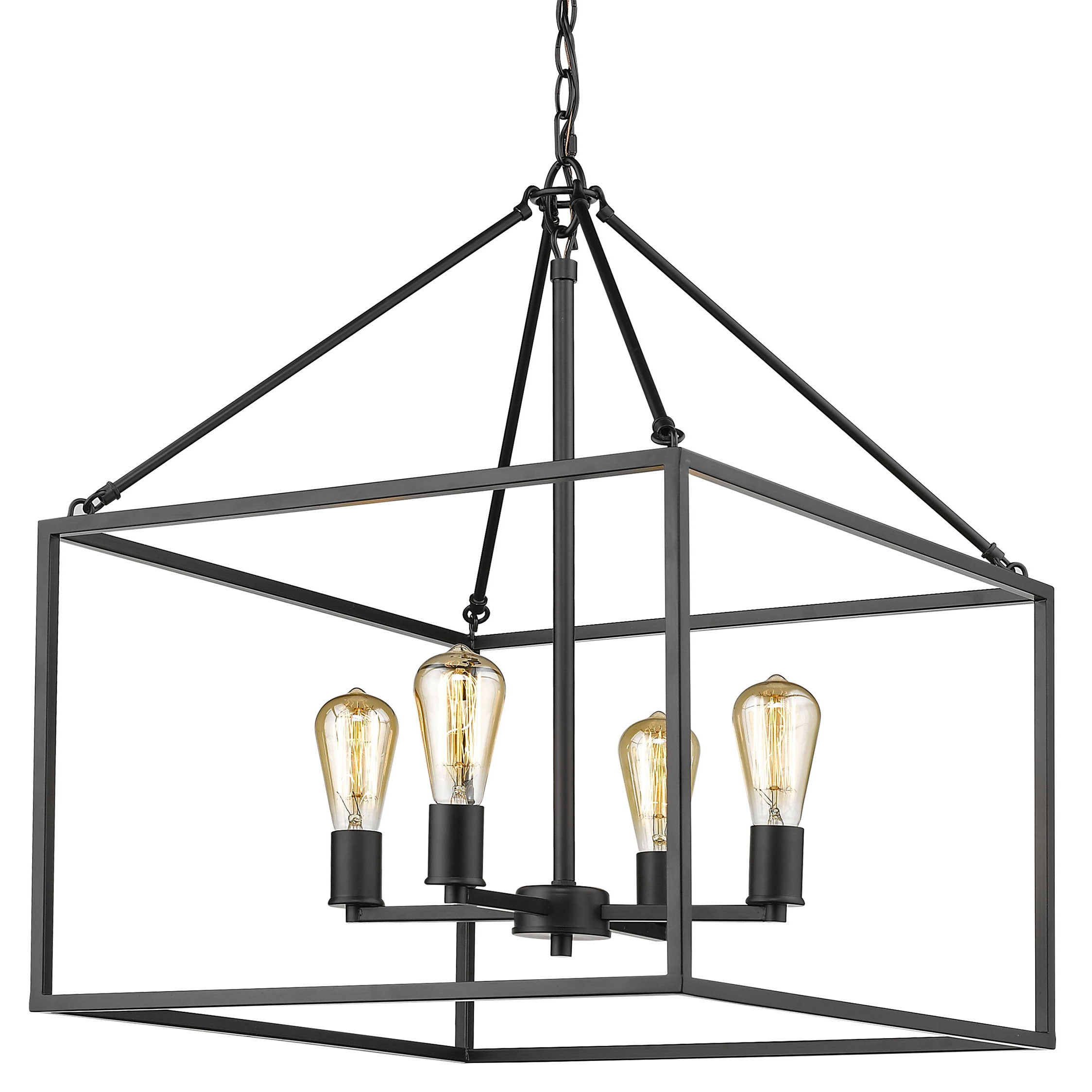 The Wesson Chandelier is a clean contemporary fixture. The industrial look is enhanced by the exposed medium-based bulbs inside the square tubing of the open, geometric cages. Complete the modern, rustic look by installing Edison Bulbs. This 4-light chandelier's generous frame makes it perfect for large open spaces, while its height allows it to work comfortably in 8-9' ceilings.