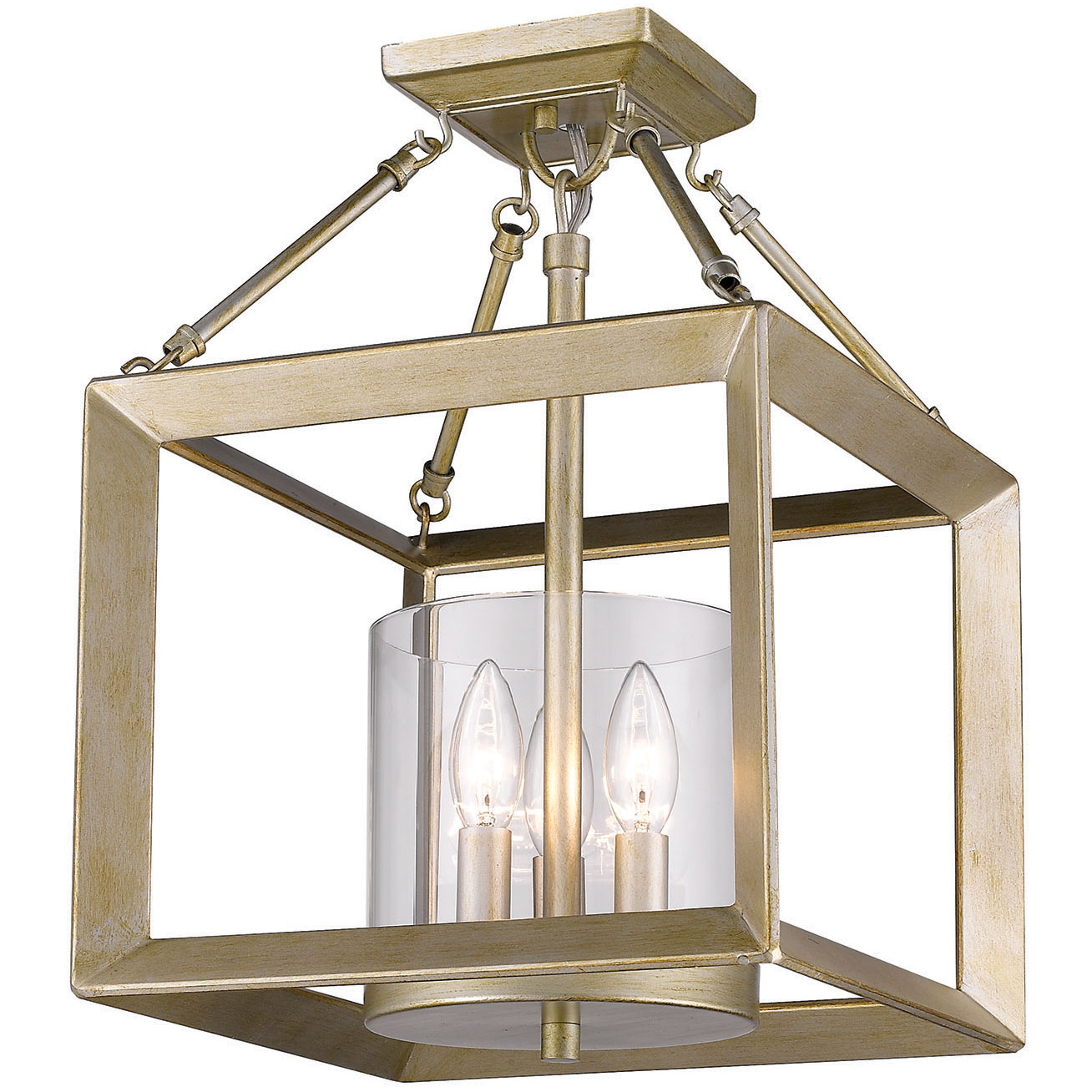 Modern lanterns featuring a handsome beveled cage design make an elegant statement in the Smyth collection. Clean geometry creates contemporary style with steel candles and candelabra bulbs encased in glass. Can be mounted as a pendant or semi-flush ceiling light.