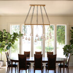 The Drape Skirt Linear Chandelier features 15 individual handblown glass globes supported by a series of Brass skirt structures along the length of a brass bar.