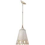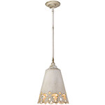 Enhance your space with the rustic elegance of Eloise. Hand-painted to mimic a treasure you would find in a French bazaar; the faded antique finish adds to the vintage quality. Carved patterns in the fixture's metal shade play with light and shadows creating a unique visual effect. The openings allow ambient light to spread through the room. Hang this beautiful mini pendant alone or hang in a group.