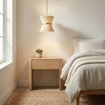 The Cecilia Pendant features a dramatic hourglass silhouette made of hand-wrapped rope. A metal band finished in distressed Patinaed Brass loops around the strings like a belt, giving the pendant a glamorous flair.