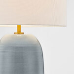 The Fanny Slim Table Lamp is characterized by its rounded ceramic body with finely combed texture. Topped by a white linen drum shade that casts warm shadows of light across your room.. Its simple, clean profile and neutral finishes work well in many interior design settings. On/off switch on located on the lamp socket.
