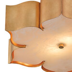 The Grand Lotus Ceiling Flush Mount has an aristocratic statement with a touch of Moorish inspiration. Finished in a luxurious workmanship finish and gold leaf interior, the stylish curves of the six-pointed wrought iron frame encase a pearly marbleized acrylic diffuser.