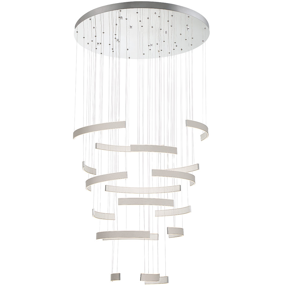 The striking Verdura Chandelier is a multi-tier arrangement of edge-lit LED ring segments finished in two-tone vegan leather. The 17 arcs feature light-colored pebbled faux leather on the inside and a complementary darker tone on the outside, and their positions can be adjusted to create an endless variety of configurations. This chandelier makes a dramatic statement in a range of spaces, from offices to foyers and grand staircases. Note: requires a junction box rated for fixtures weighing over 50 pounds.