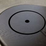 The Eclipse Desk, designed by Fred Rigby Studio, features a curved, organically shaped tabletop crafted from solid oak. The top is supported by a flat oak leg and cylindrical steel column that complements the asymmetrical design with dramatic flair. The columnar leg houses a concealed storage compartment to keep the top of the desk clear and clutter-free.
