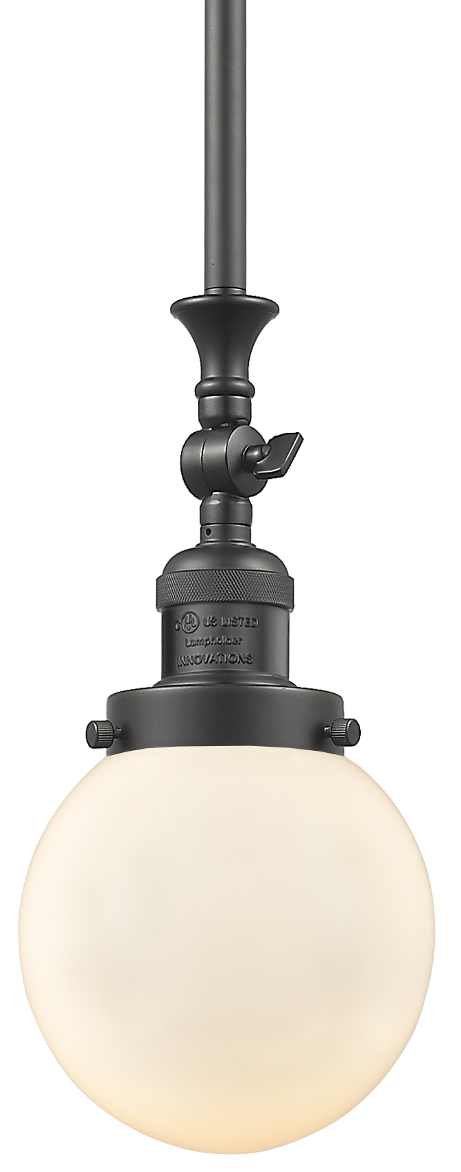The Beacon 206 Pendant adds a clean classic look to your interior space. The slender metal frame is complemented by a smooth glass globe that casts warm shadows across your room. Features a side knob on the stem for a 180 degree adjustable swivel with engraved cast cap. Includes a 90 degree hang straight swivel for sloped ceilings. Canopy: 4.5 inch diameter.