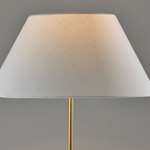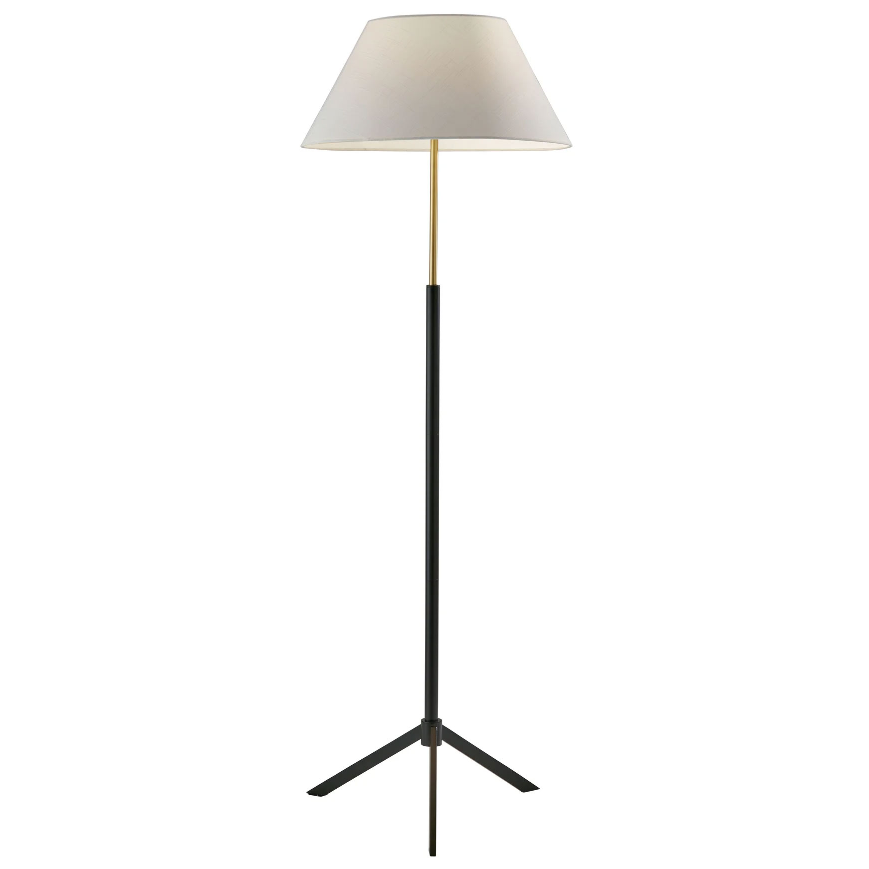 With a stylish blend of materials and striking tripod design, the Harvey Floor Lamp brings modern chic vibes to any room and is perfectly suited for bedrooms, offices, or living areas. The triangle base in black metal finish continues up the pole before transitioning to a slender brass tube. Topping the lamp a is modified white linen drum shade that adds soft texture to the contrasting metal lamp construction and diffuses the light with a warm glow. 3-way switch on socket.